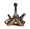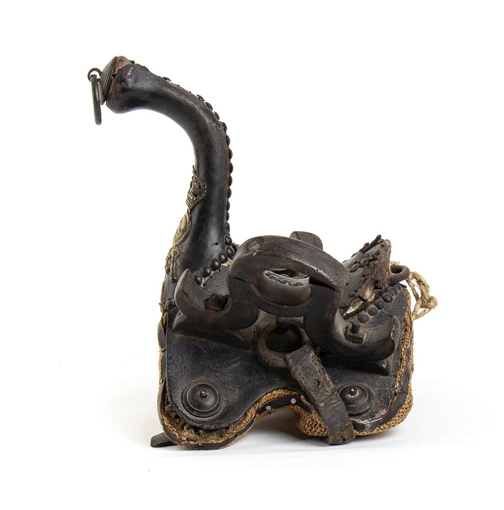 Bellissimo modello di basto per muli in pelle, legno ed attributi metallici,imbottito di paglia, decorato frontalmente di fregio metallico del 6° rgt lancieri di Aosta a cui mancano le punte delle lancie