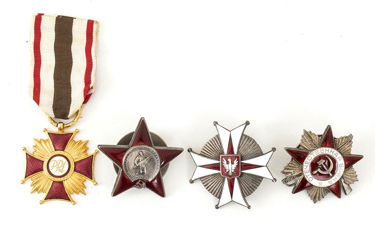 Composto da ordine della Stella Rossa e della Guerra patriottica di seconda classe del tipo distribuito nel 1985,, distintivo polacco con attacco a vite ed ordine al merito della Repubblica socialista di Polonia