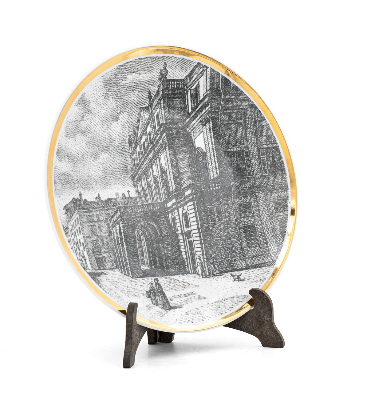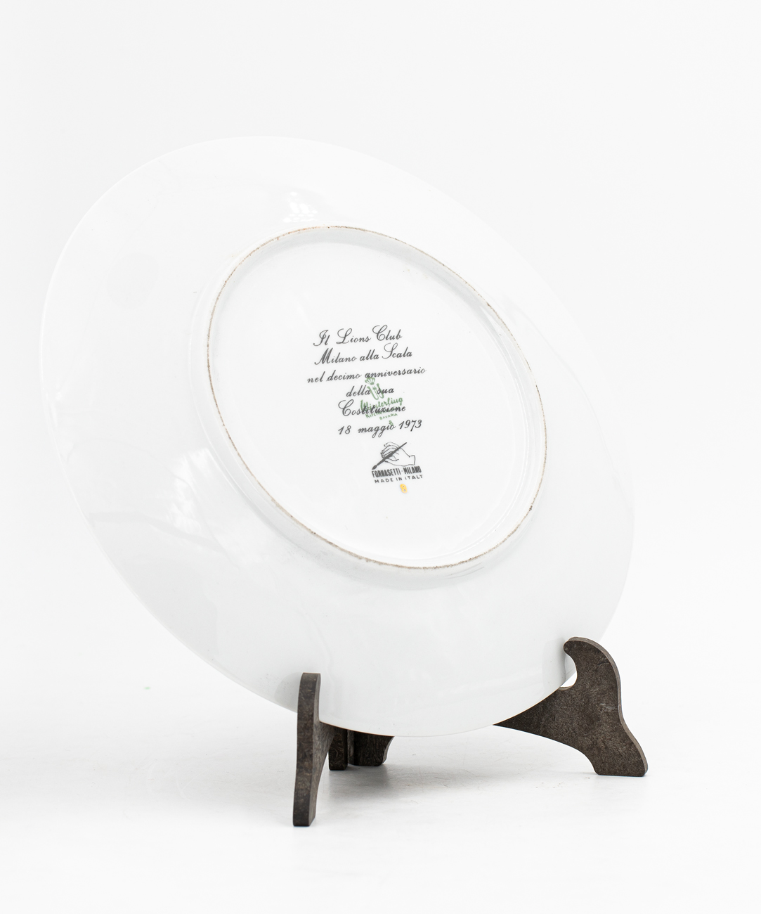 Iscrizione 'Piatto realizzato per il decimo anniversario della costituzione del Lions Club di Milano' e marchio della manifattura serigrafati al retro