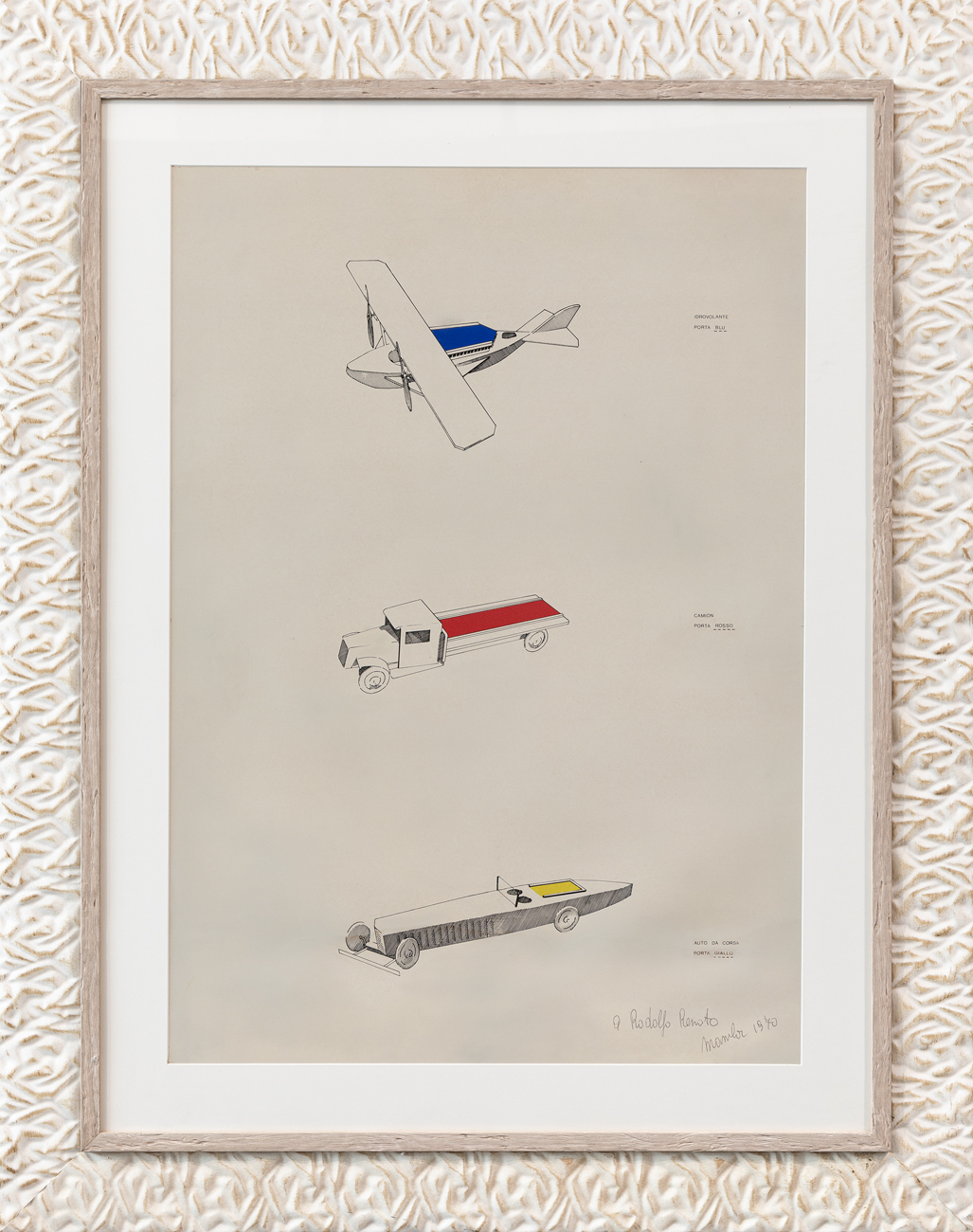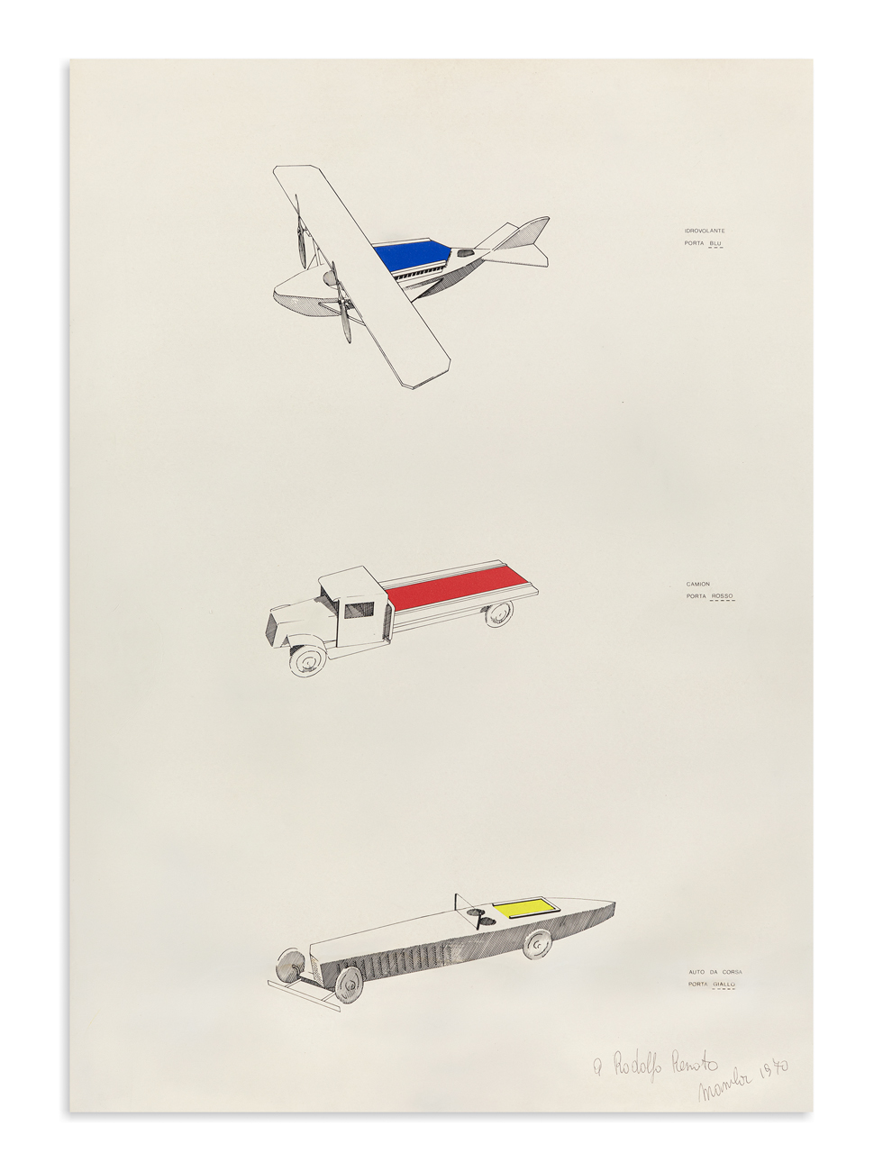 RENATO MAMBOR (1936-2014) - Idrovolante porta blu, Camion porta rosso, Auto da corsa porta giallo, 1970