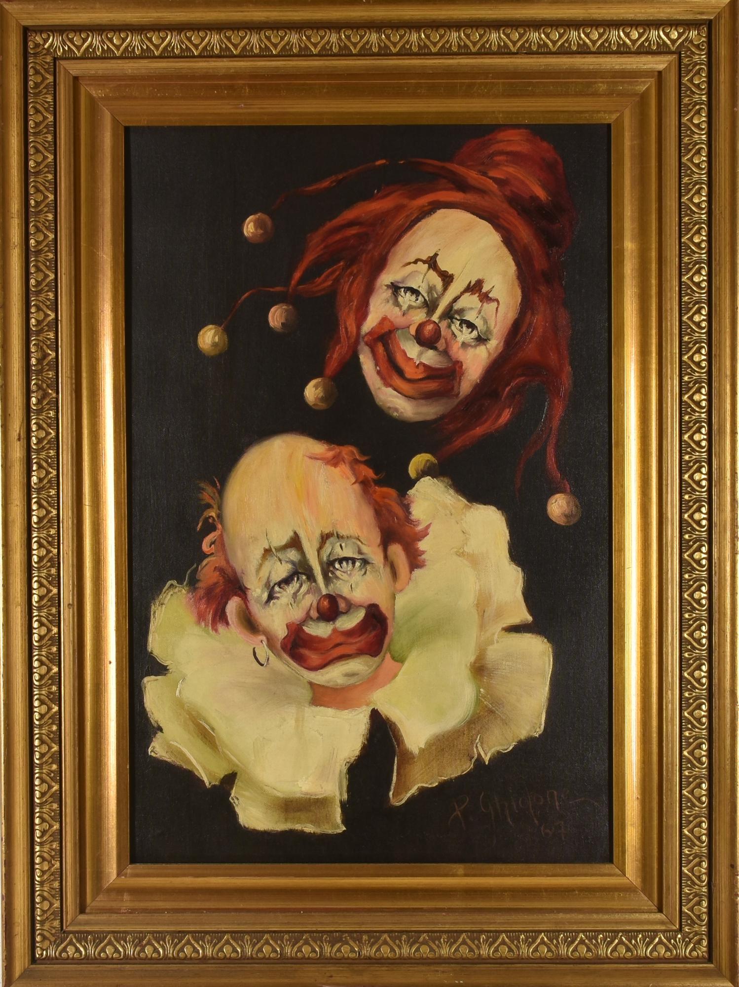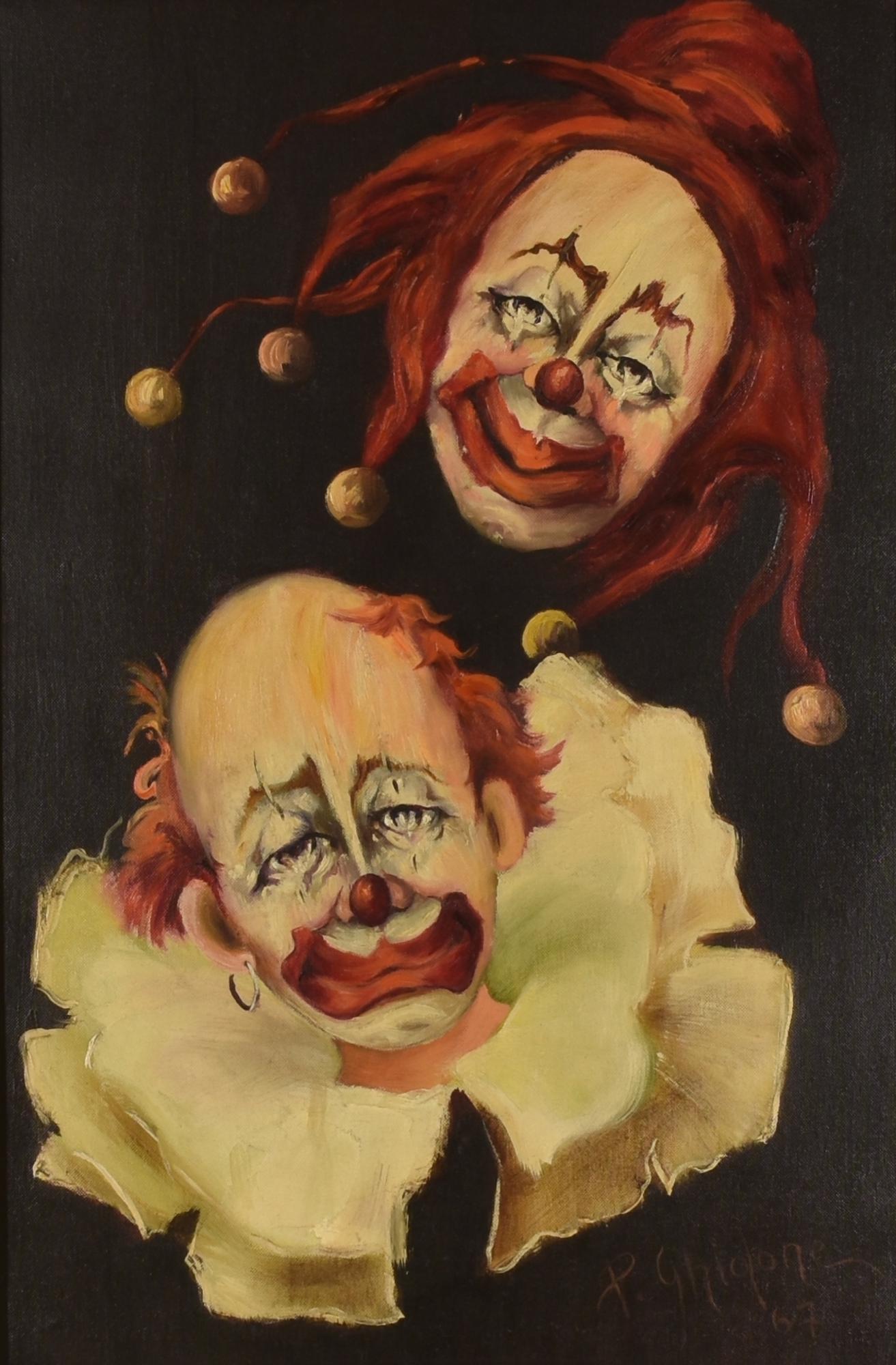 P. Ghidone I PAGLIACCI olio su tela, cm 60x40 firma e data eseguito nel 1967