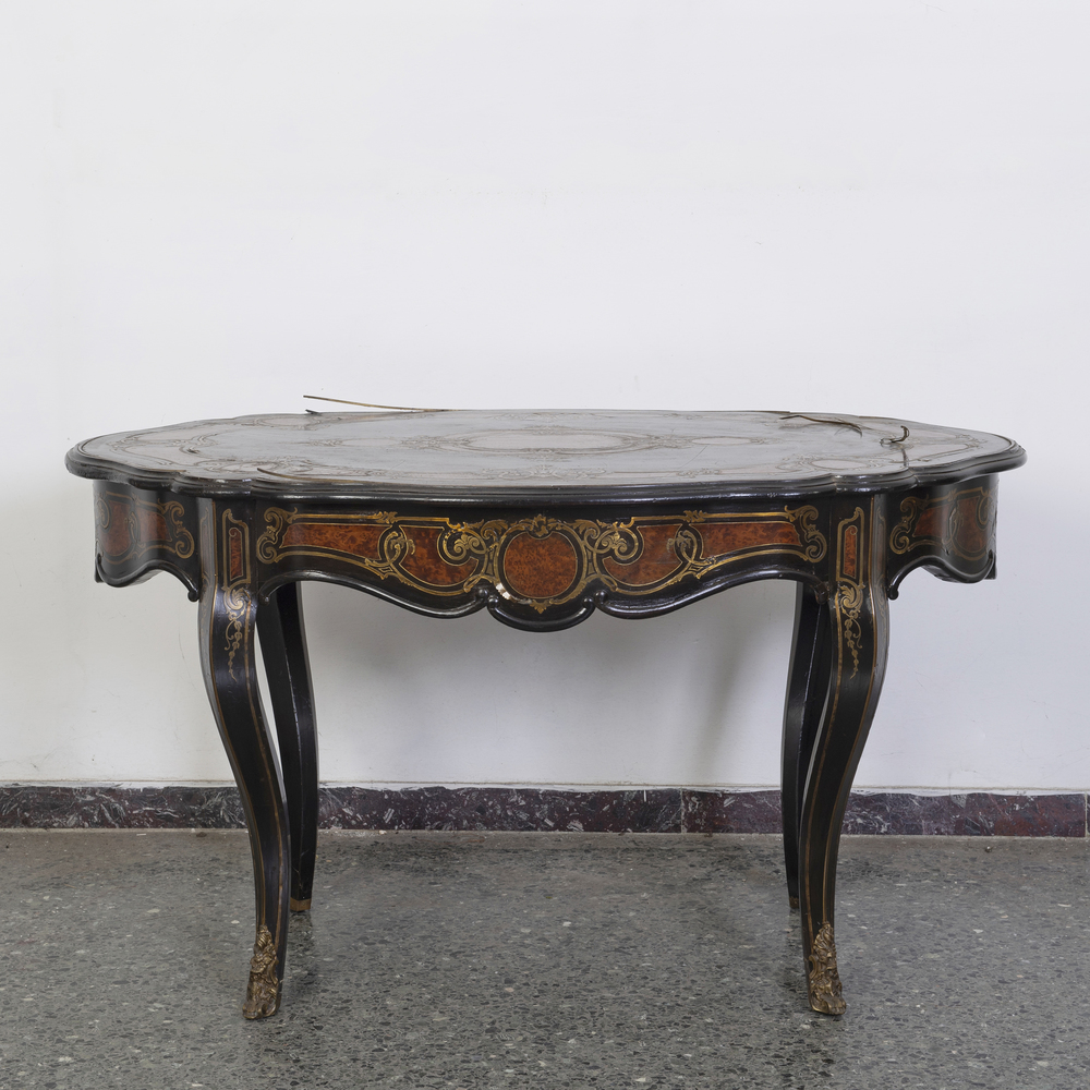Tavolo in stile Boulle in legno ebanizzato con intarsio in tuia