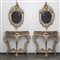 Coppia di consolle con piano in marmo e specchiera, in legno laccato e dorato