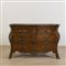 Comode lastronata in noce con fronte e fianchi mossi, piano in marmo e finiture in bronzo dorato