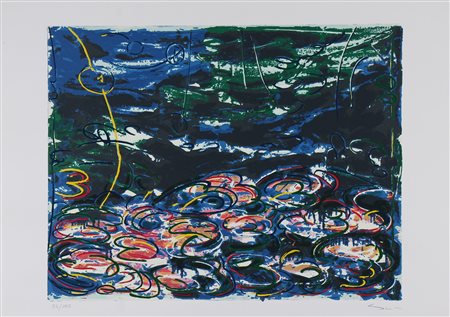 SCHIFANO MARIO (1934 - 1998) Gigli d'acqua. Serigrafia. Cm 100,00 x 71,00. Misure lastra: 77,5x60,5 cm. Tir. 23/125 e firma in basso a matita. Timbro a secco Mastrogiacomo editore, Padova. In allegato all'opera copia del depliant della Galleria d'arte/Casa editrice Mastrogiacomo, con descrizione dell'opera.