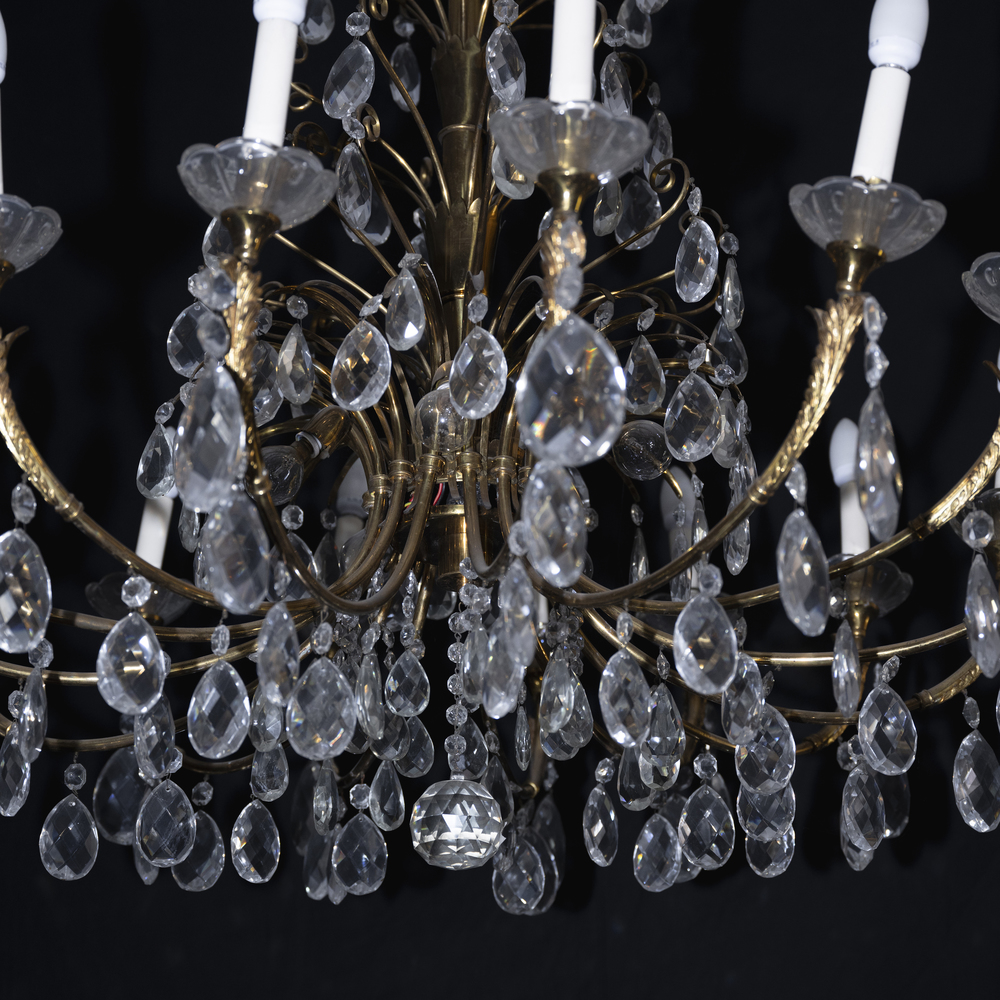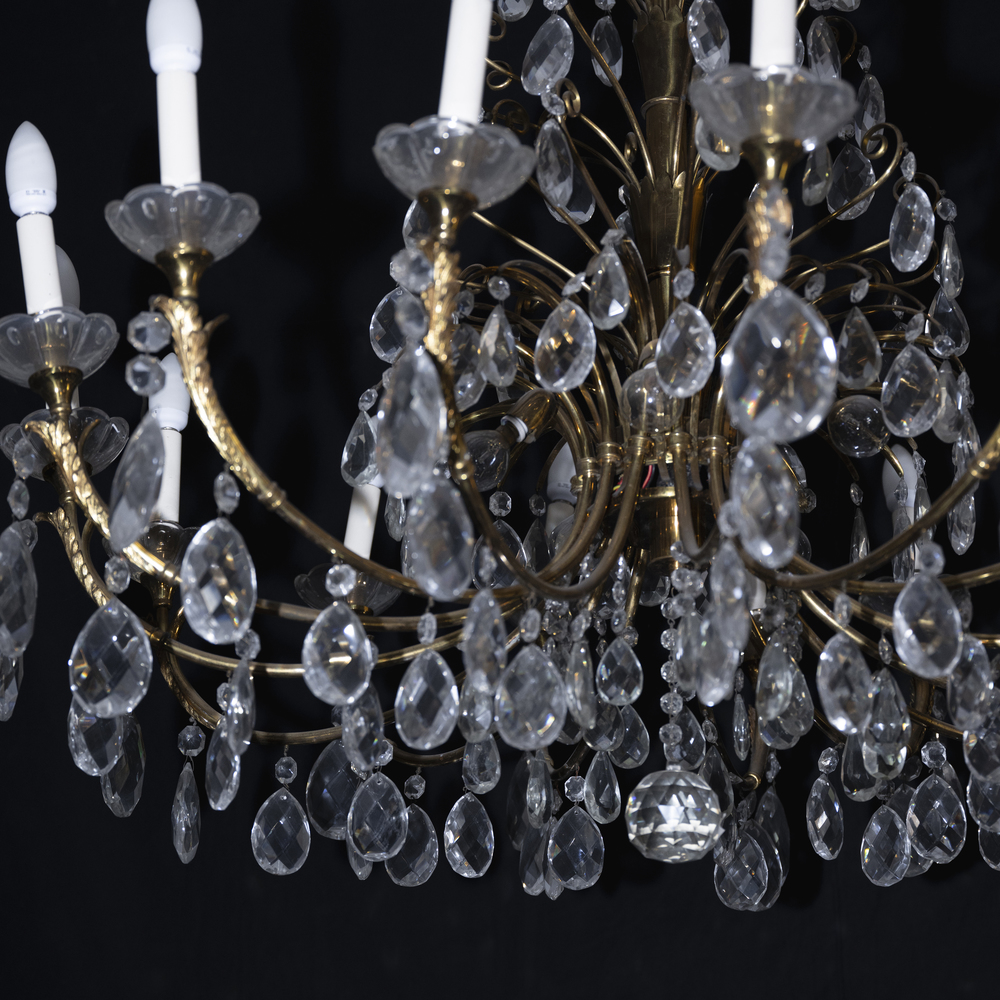 Lampadario a quindici luci in metallo dorato con pendenti in cristallo