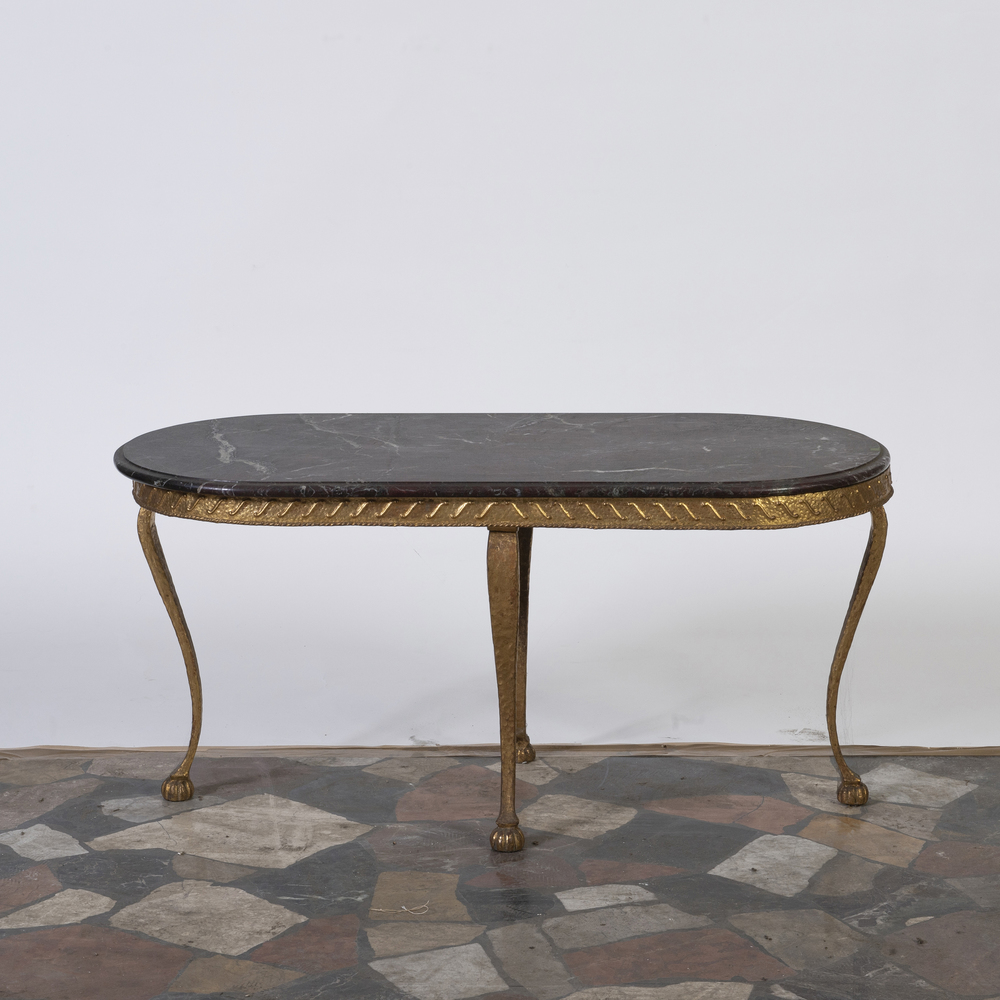 Tavolo da salotto in ferro battuto dorato con piano in marmo