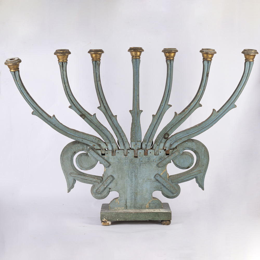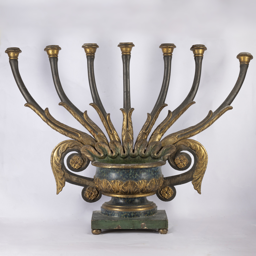 Candelabro ebraico (Menorah) a sette fiamme in legno laccato e dorato