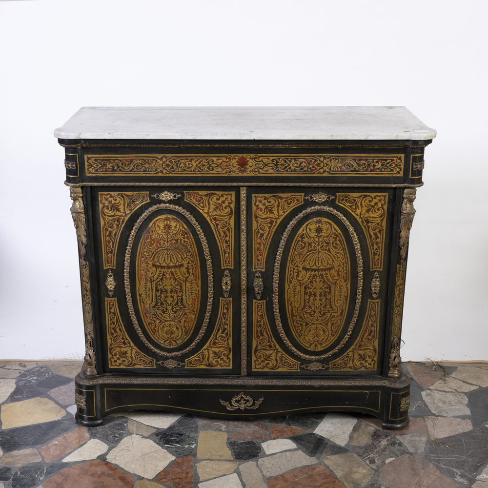 Credenza in stile Boulle in legno ebanizzato e con piano in marmo