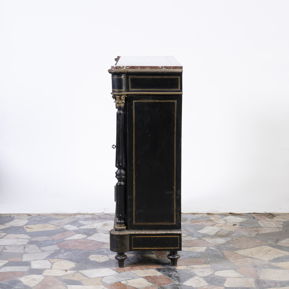 Credenza in legno ebanizzato finemente intarsiata in ottone e con piano in marmo