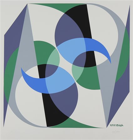 BALLA GIACOMO (1871 - 1958) Ecquilibrio spaziale. 1926. Serigrafia. Cm 70,00 x 74,00. D'apres. Dimensioni lastra: 64x64 cm. Tir. 87/150 a matita in basso. Firma serigrafata Futur Balla in basso a destra. Timbro a secco Balla Futurista e serigrafia dell'originale Futurballa in basso. In allegato all'opera dichiarazione di garanzia a cura di Luce Balla