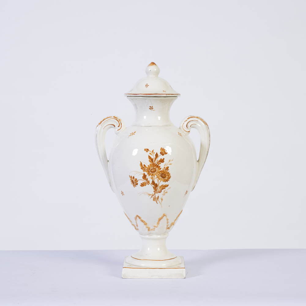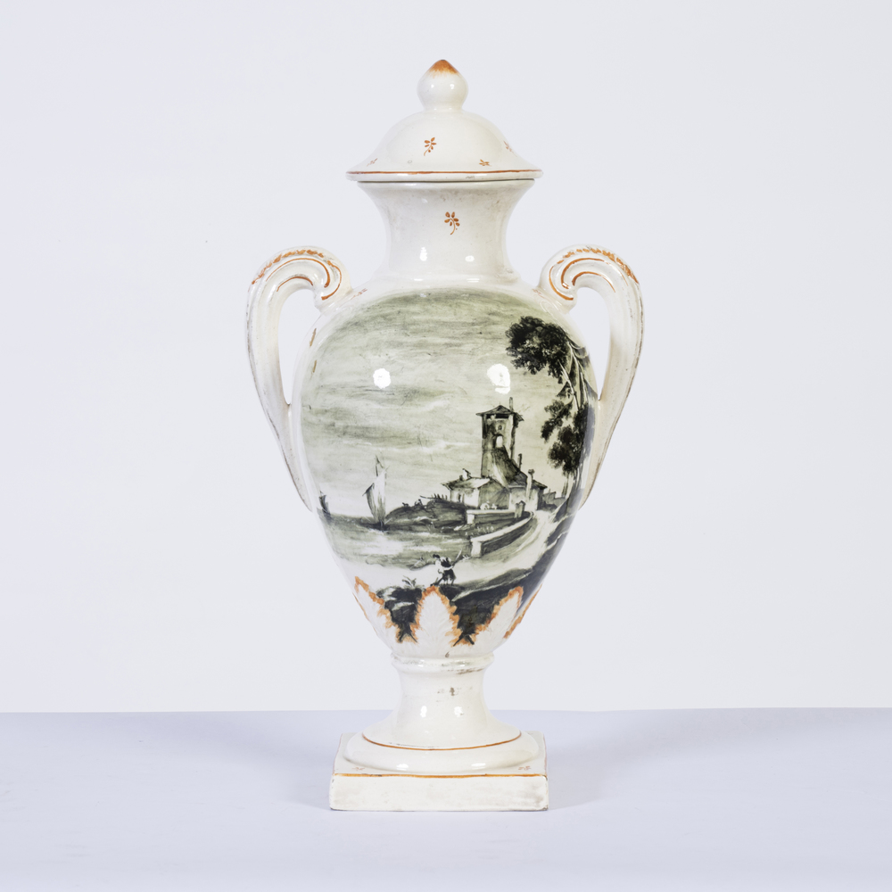 Vaso biansato in ceramica Nove di Bassano, decorato con paesaggio