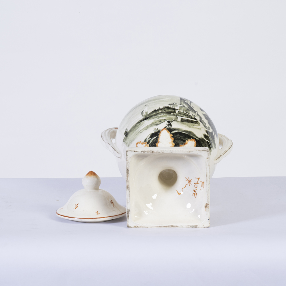 Vaso biansato in ceramica Nove di Bassano decorato con paesaggio