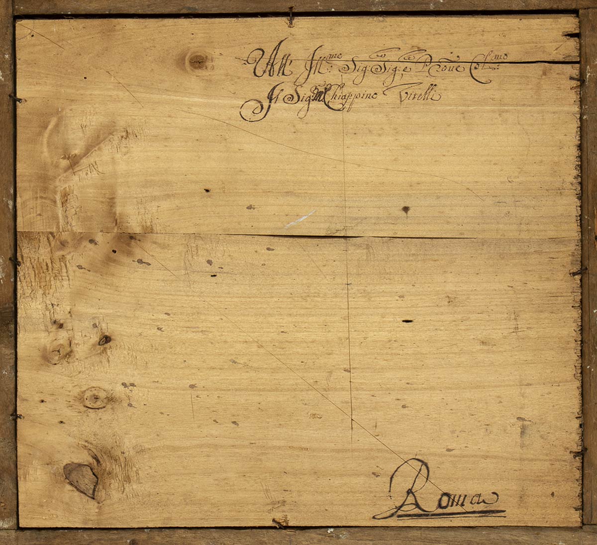 La tavola reca sul retro, in alto al centro, antica iscrizione a penna:"ALL'ILL.MO SIG: SIG: [..] COL.MO IL SIG. CHIAPPINO VITELLI" e in basso a destra iscrizione a penna:"ROMA".