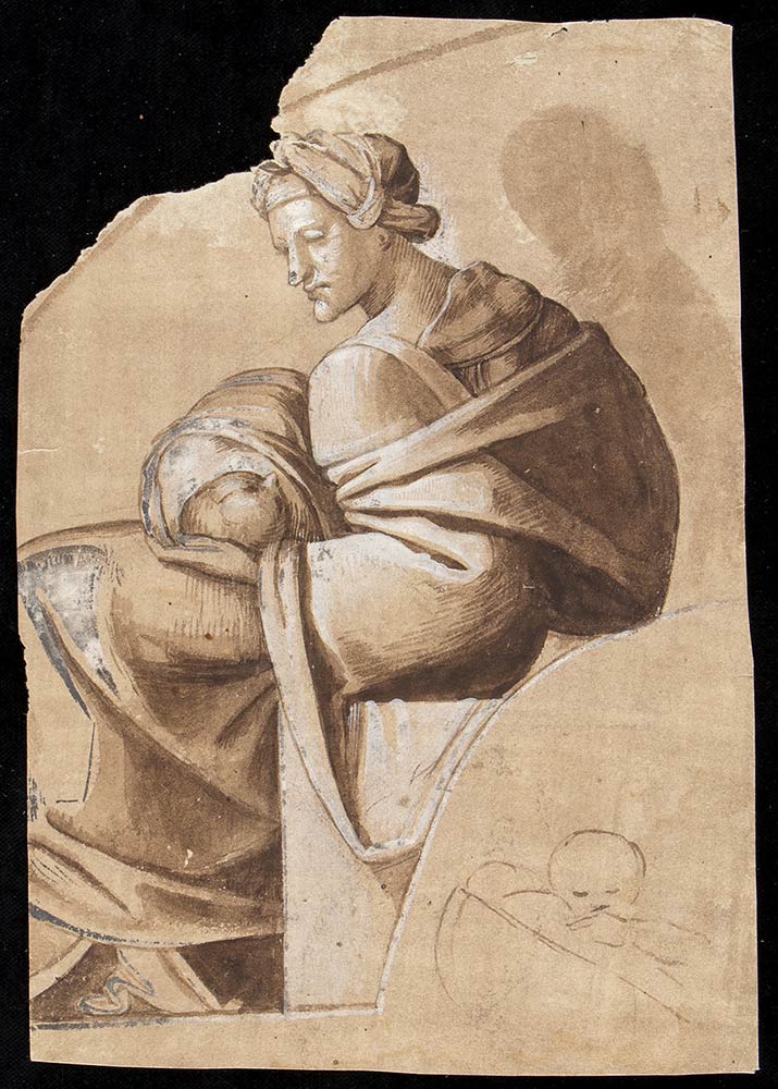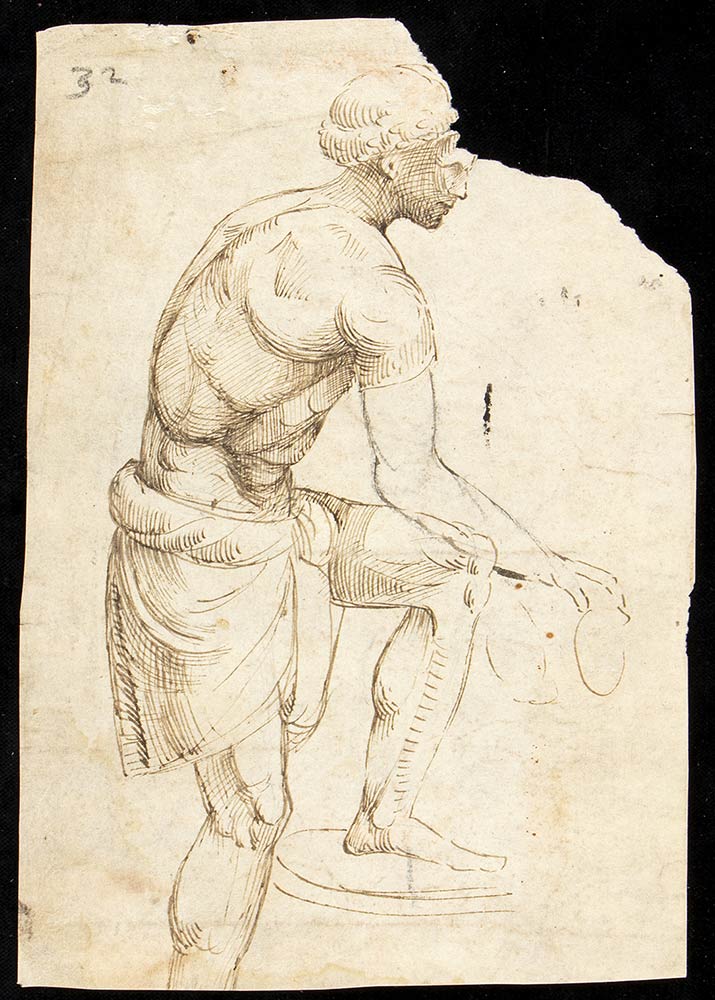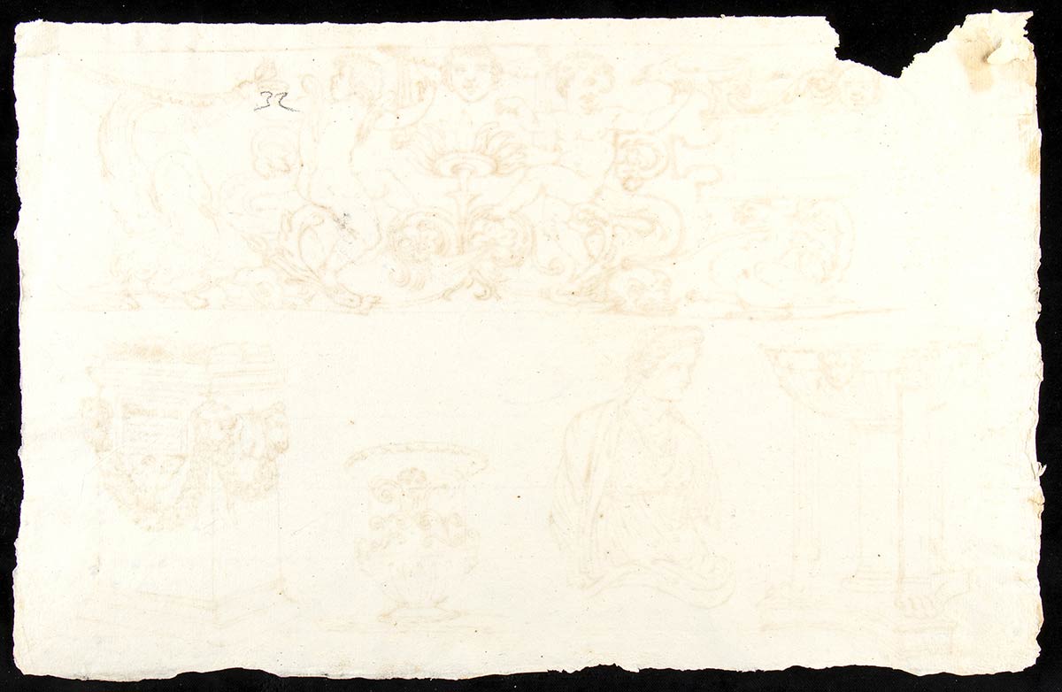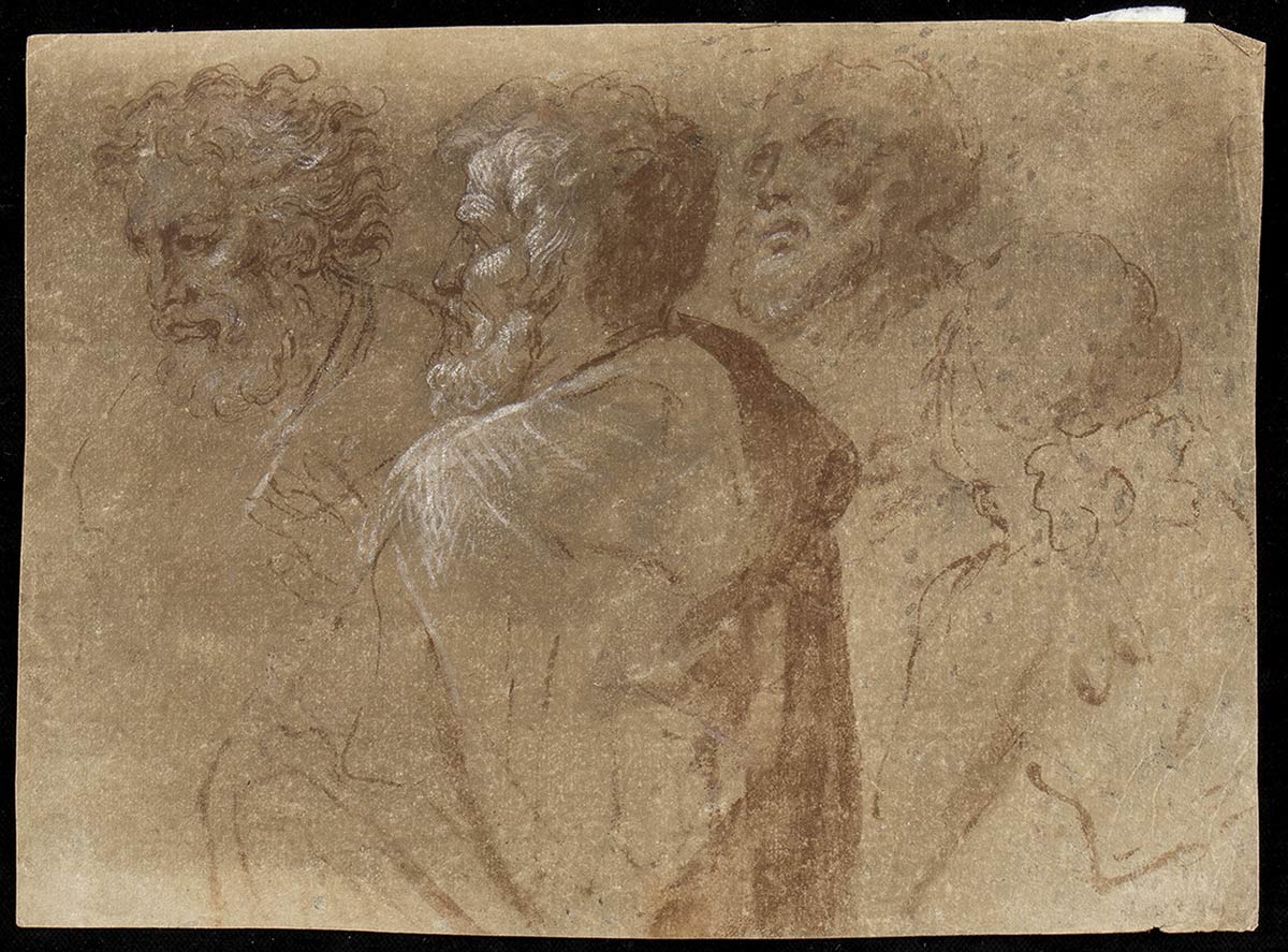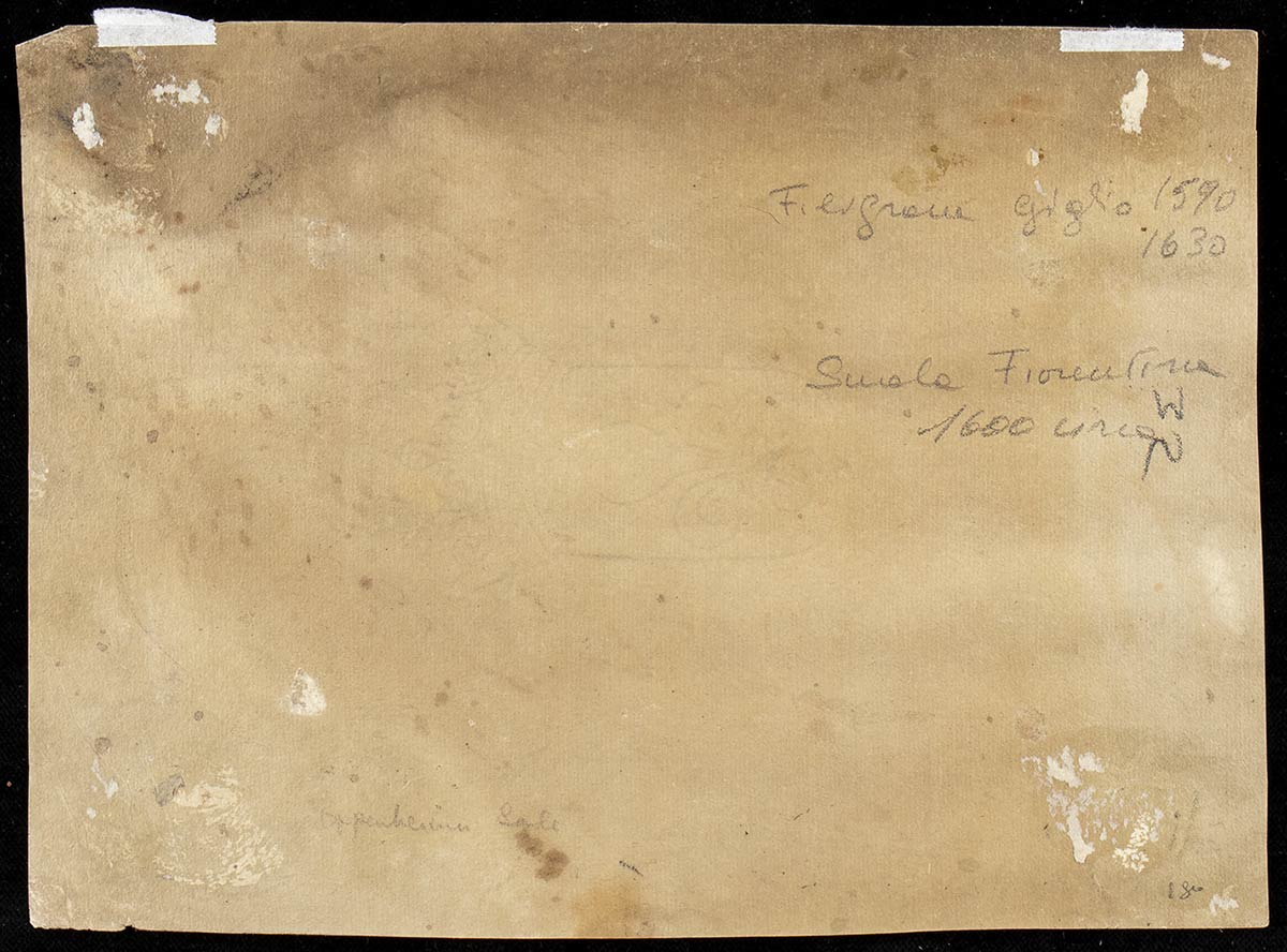 a) Matita bianca e inchiostro su carta bruna vergellata e filigranata, cm. 17,5x24; b) inchiostro e matita su carta vergellata e filigranata, cm. 29,5x44; c) recto - inchiostro, biacca e acquerello su carta bruna; verso - penna e inchiostro su carta, cm. 26x18, margini irregolari
