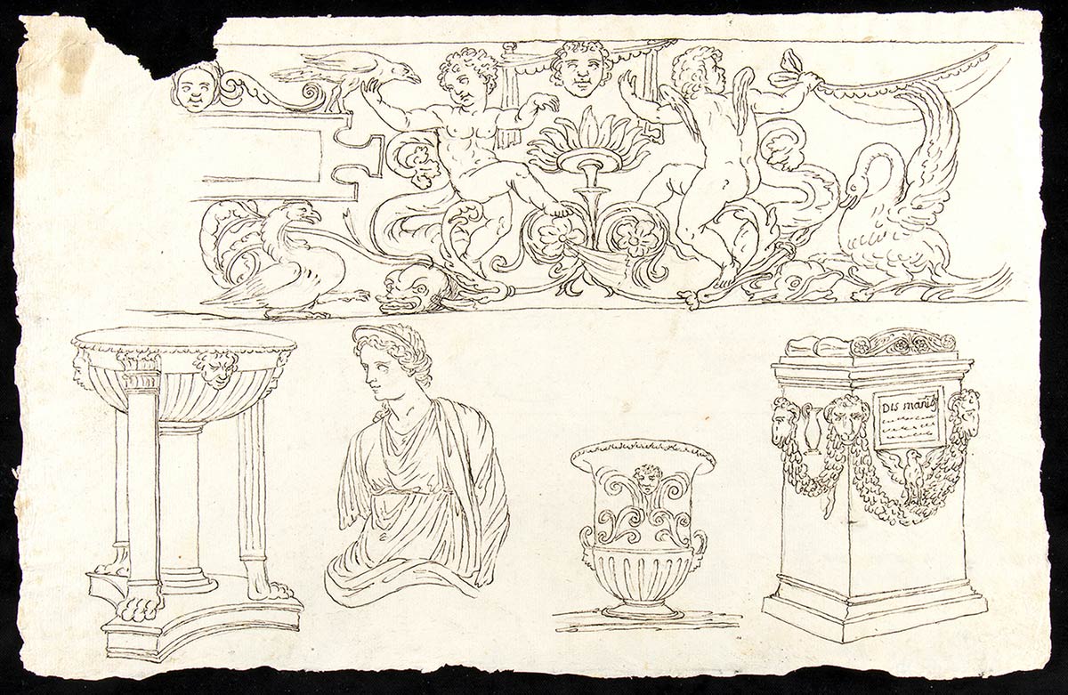 Gruppo di tre disegni: a) Sudio per testa di uomo barbuto; b) schizzi di vari elementi architettonici; c) recto - donna con bimbo in fasce; verso - figura maschile