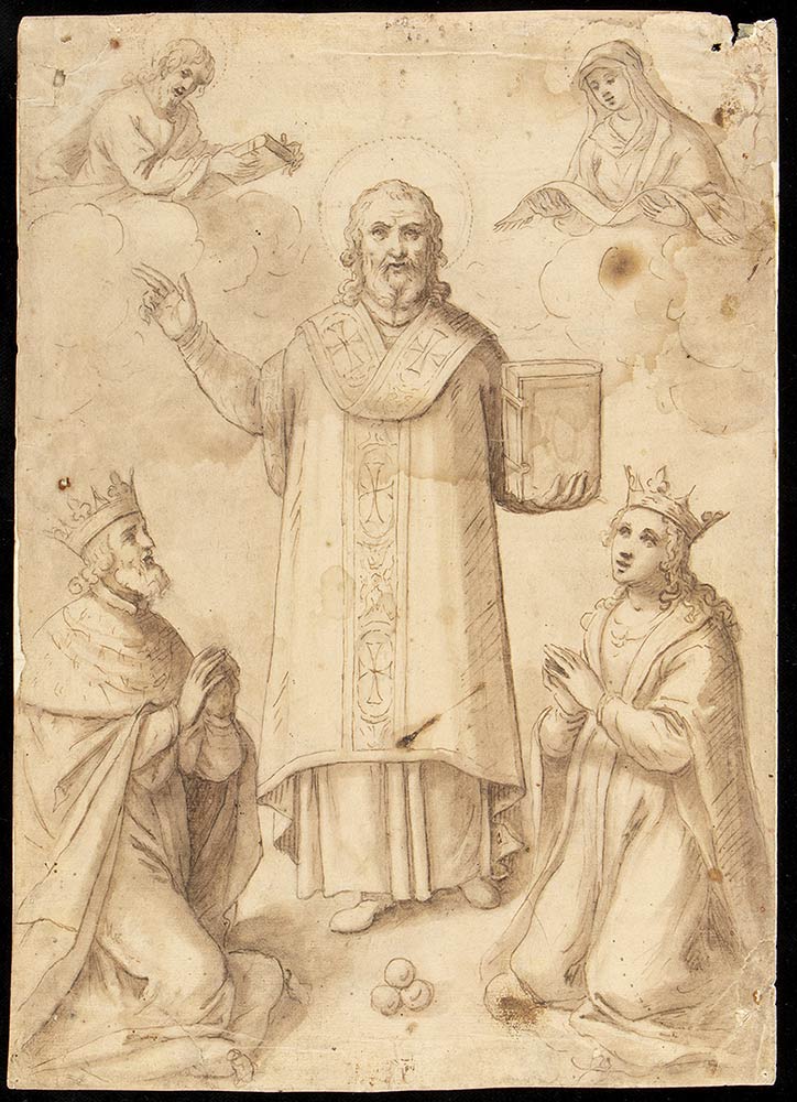 San Nicola di Bari con coppia di reali, Cristo e la Vergine tra le nubi