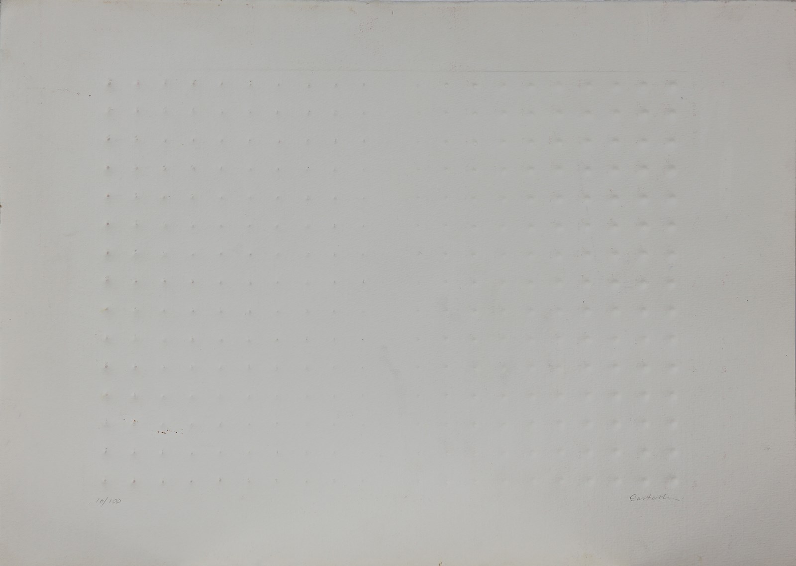 CASTELLANI ENRICO (n. 1930) Superficie Bianca - Rilievo. Litografia. Cm 70,00 x 50,00. Misure lastra: 37x51 cm. Tir. 10/100 e firma in basso a matita. Opera pubblicata sul catalogo Leonardo Magini, Enrico Castellani: opera Grafica (1960-1995), ed. Corraini, 1996. Carta leggermente sporca.