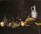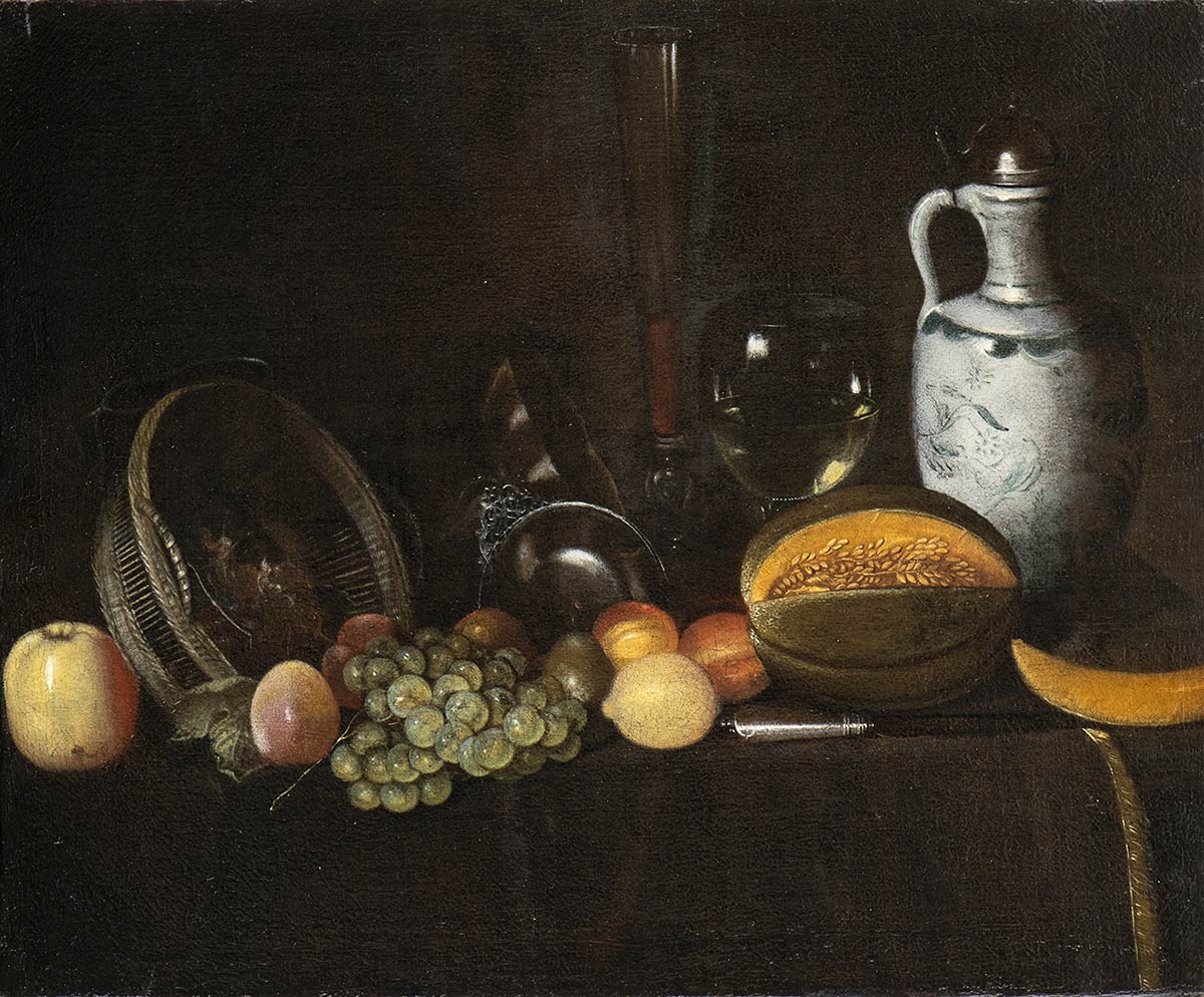Natura morta di frutta con calici di cristallo e brocca di ceramica