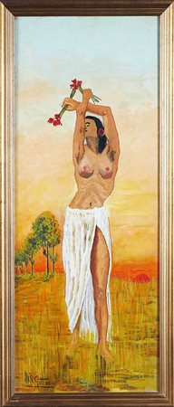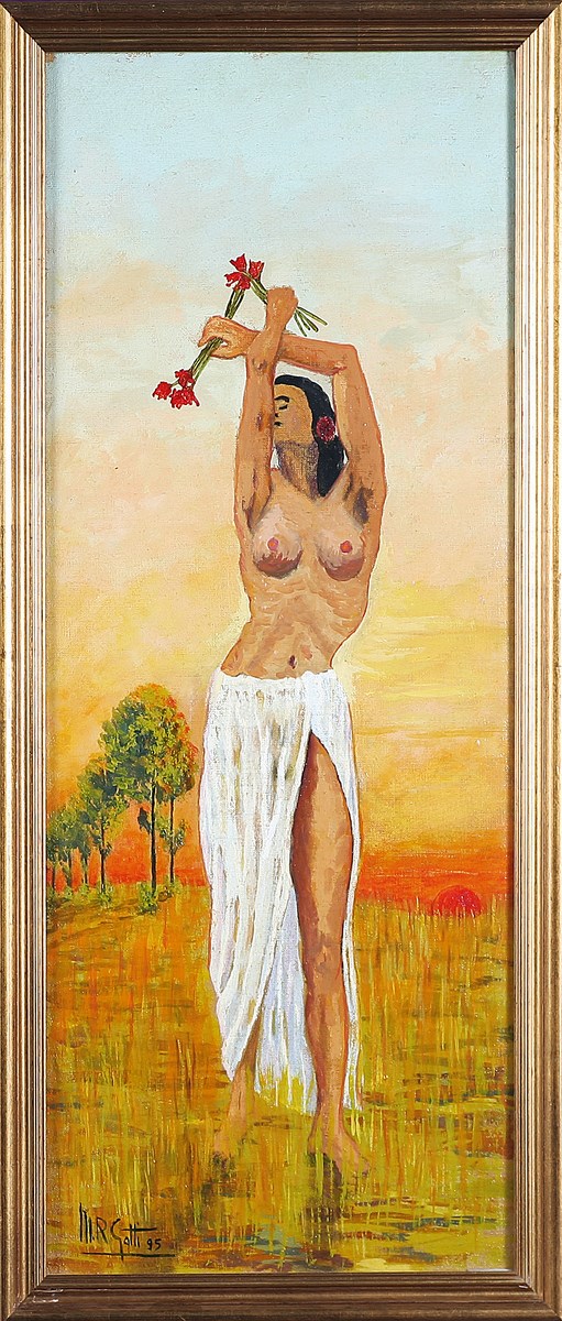 GATTI MARIO Ragazza Hawayana. 1995. Olio su cartone pressato. Cm 28,00 x 70,00. Firma e anno in basso a sinistra. Cornice presente