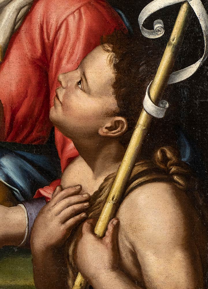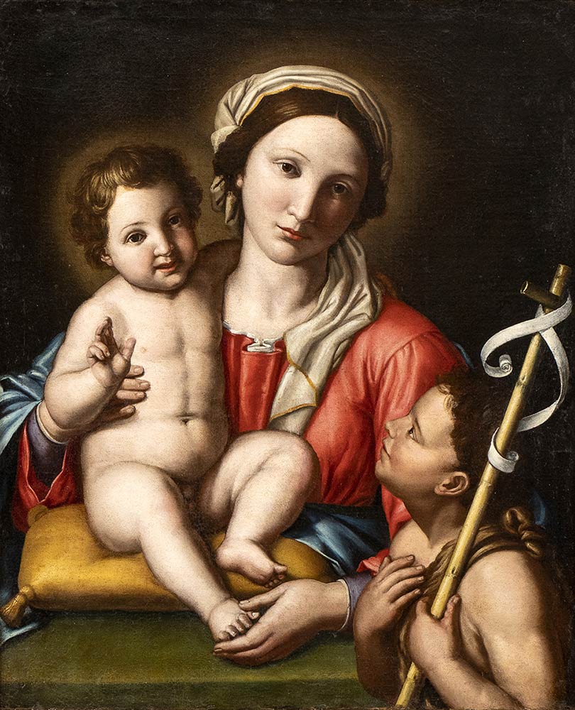 Questa tela smagliante costituisce un notevole esempio della produzione dell'atelier del Sassoferrato a stretto ridosso dell'attività del maestro. Come sempre in questi casi, il dipinto recupera un'invenzione compositiva che Sassoferrato aveva in prima battuta fissato su un meraviglioso disegno quadrettato conservato nelle Royal Collections a Windsor Castle e tradotto pittoricamente in varie versioni, fra cui ricordiamo quella del Musée Fesch di Ajaccio, quella passata nella vendita Boetto il 28 settembre 2009 (l. 42) e il dipinto murale del Battistero di San Giovanni in laterano