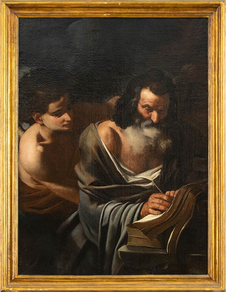 Questa bella raffigurazione di San Matteo, impegnato nella scrittura del suo vangelo grazie all’ausilio amorevolmente partecipe dell’angelo, si mostra intrisa di umori caravaggeschi, a partire dall’inaggirabile esempio delle due versioni approntate da Caravaggio per la Cappella Contarelli in S. Luigi dei Francesi. Non siamo qui nell’ambito di un caravaggismo ortodosso e nemmeno prossimo agli artisti della cosiddetta “manfrediana methodus”, ma piuttosto nell’area di una ricezione personale e riformata della lezione del grande maestro, alla Saraceni per intenderci, che sembra di poter indirizzare nella direzione di alcuni degli artisti francesi attivi a Roma tra secondo e terzo decennio del Seicento. Senza l’intenzione di sciogliere il rebus attributivo, ma solo per offrire una possibile traccia di lavoro, segnaliamo in questa sede le tangenze stilistiche che avvicinano la nostra tela alla lettura elegante e astratta della pittura di Caravaggio offerta da artisti come Guy François, il Pensionante del Saraceni o il primo Nicolas Régnier.