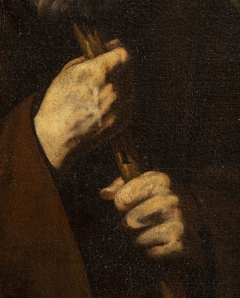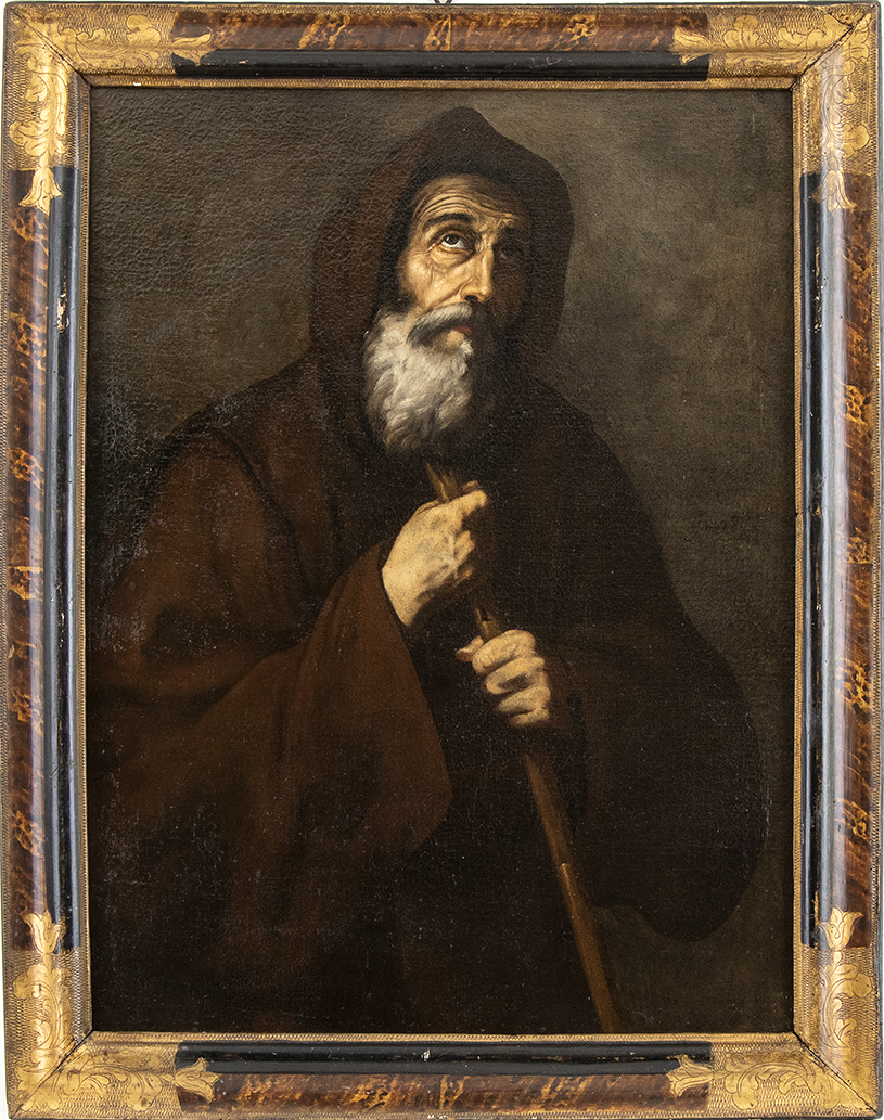 Questa raffigurazione intensamente naturalista di San Francesco di Paola si pone in stretta connessione con una composizione di Jusepe de Ribera di cui non è attualmente individuato il prototipo autografo, ma che ci è nota grazie ad alcune repliche dovute ad aiuti e seguaci del maestro. La presente redazione, di alta qualità e riferita a Ribera già in antico, rappresenta un notevole documento della fervida attività dei pittori operosi a Napoli nel secondo quarto del Seicento intorno al grande maestro spagnolo e strettamente dipendenti delle sue invenzioni. La tela costituisce anche una trasparente testimonianza dell’elevatissima richiesta di dipinti di Ribera, o strettamente legati ad essi sotto il profilo dello stile e della composizione, presso i committenti napoletani, come pure dell’alto standard qualitativo dei pittori riconducibili più o meno direttamente alla sua cerchia, tra i quali, è bene rammentarlo, artisti del livello di Hendrick van Somer, Juan Do, Bartolomeo Passante, Giuseppe di Guido (già Maestro di Fontanarosa) e il Maestro dell’Annuncio ai pastori. Ribera dovette sviluppare due redazioni del soggetto: una con il santo a mezzo busto che reca nella mano destra il cartiglio con l’iscrizione “CHARITAS” (di cui una versione autografa, firmata e datata 1640, è oggi in collezione privata a Ginevra); ed una seconda, con una maggiore estensione del corpo del santo, di cui il nostro esemplare costituisce una delle versioni di più alta qualità.