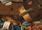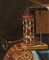 Coppia di dipinti:a) Natura morta con strumenti a corde, virginale, spartiti e pomo; b) natura morta con strumenti musicali, spartito e clessidra