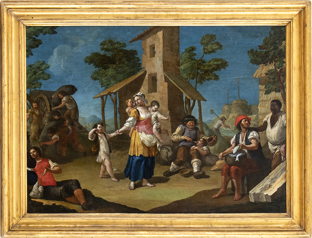 Coppia di dipinti:a) "Il Salterello"; b) vita quotidiana nel villaggio