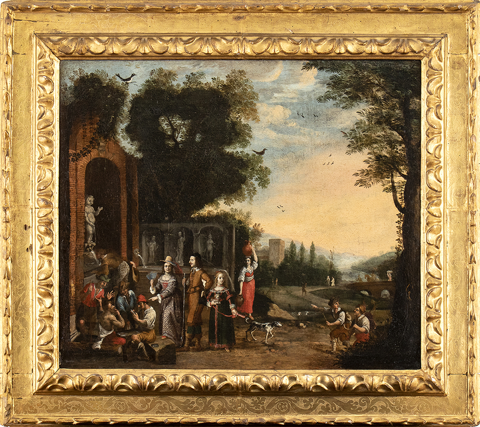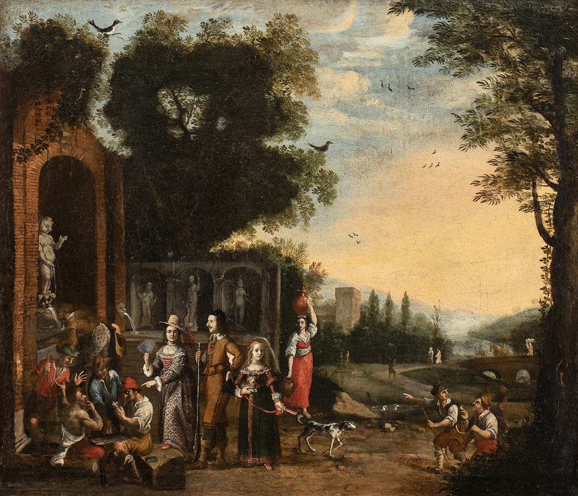 Paesaggio con giocatori di carte, nobili a passeggio e viandanti