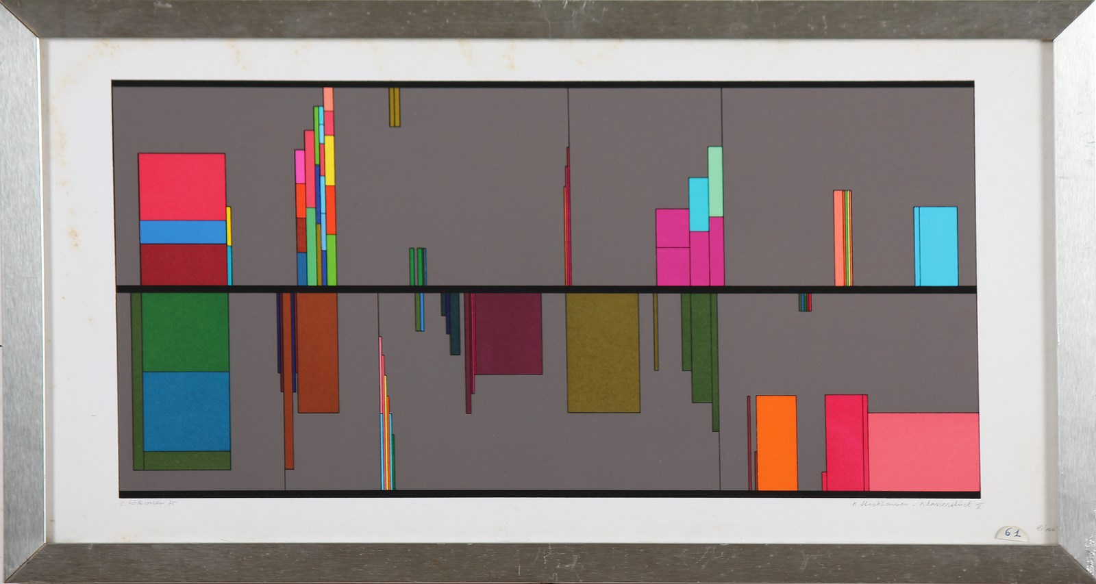 VERONESI LUIGI (1908 - 1998) Karlheinz Stockhausen - Klavierstuck V. 1975. Litografia. Cm 63,00 x 33,00. Misure lastra:27x53 cm. Tir. 87/100 in basso a sinistra a matita. Firma, titolo e data in basso a matita. Al retro cartiglio descrittivo dell'opera a cura di Biancoenero edizioni, Roma. Cornice presente