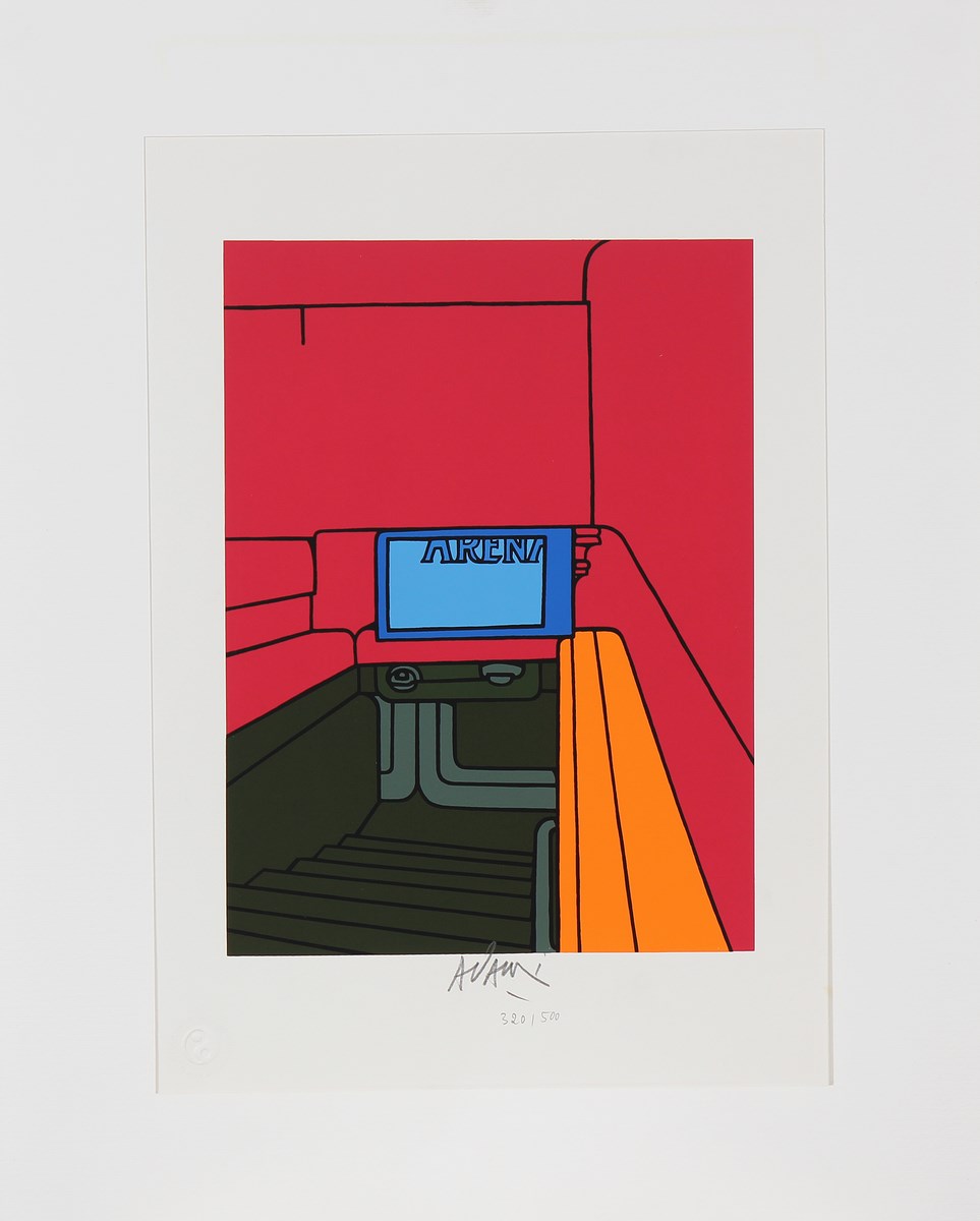 ADAMI VALERIO (n. 1935) senza titolo. Litografia. Cm 32,00 x 47,00. Misure lastra: 32x24cm. Tir. 320/500 e firma in basso a matita. Timbro a secco Giulio Bolaffi Editore in basso a sinistra. Opera incorniciata in passepartout dalle misure: 56x45cm.