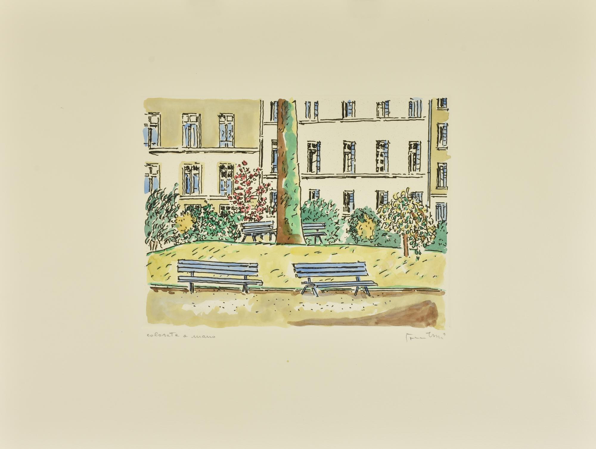 Orfeo Tamburi PANCHINE A PARIGI incisione su carta colorata a mano, battuta...