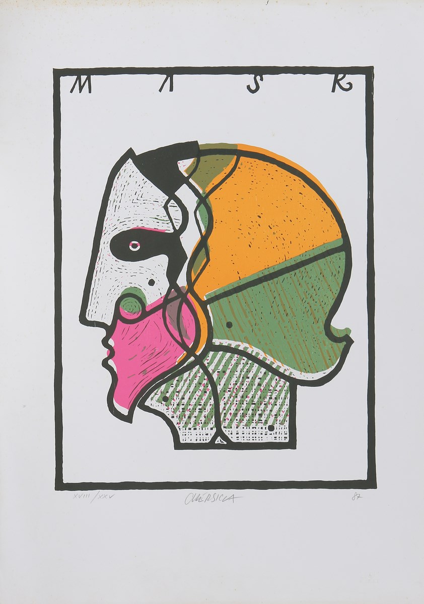 CHERSICLA BRUNO (n. 1937) Mask. 1987. Litografia. Cm 50,00 x 70,00. Misure lastra. 49x37cm. Tir. XVIII/XXV, firma e data in basso a matita.