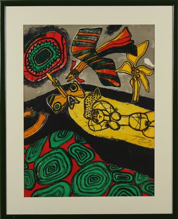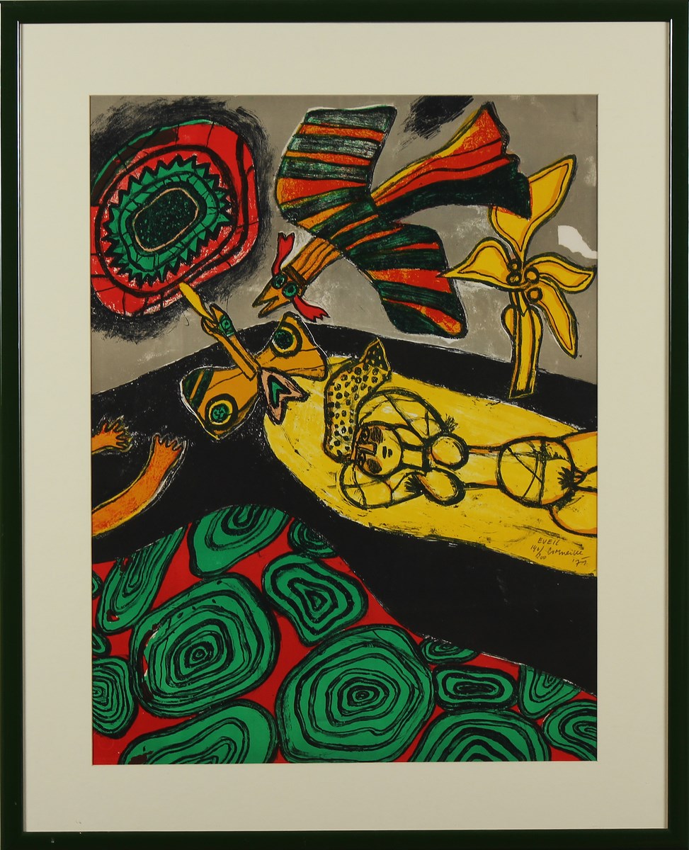 CORNEILLE (1922 - 2010) Eveil. 1975. Litografia. Cm 50,00 x 65,00. Al retro cartiglio descrittivo dell'opera. Firma, titolo, data e tir. 140/200 a sinistra.Timbro a secco Circle Graphique Europeen in basso a sinistra. Cornice presente