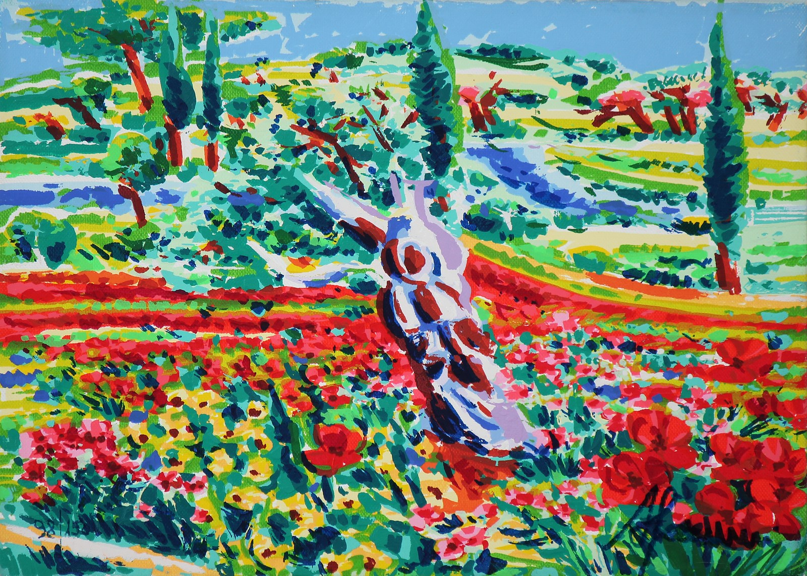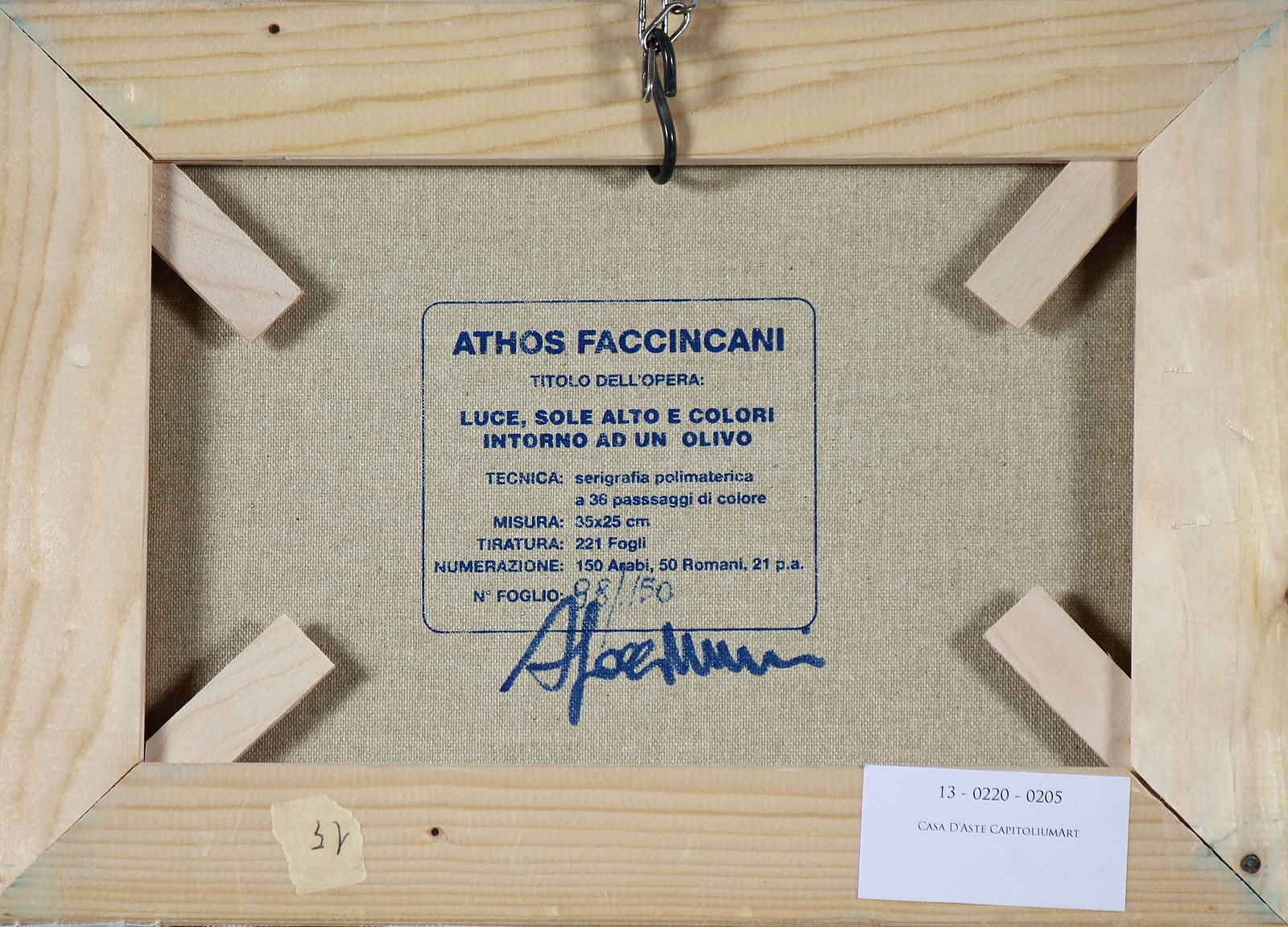 FACCINCANI ATHOS (n. 1951) Luce, sole alto e colori intorno ad un olivo. Serigrafia. Cm 35,00 x 25,00 x 2,00. Firma e tir. 98/150 in basso. Al retro descrizione completa dell'opera.