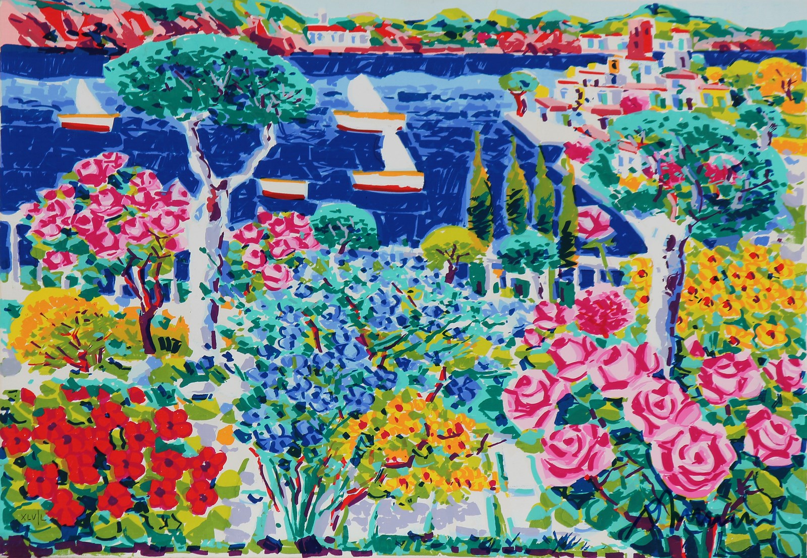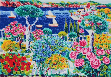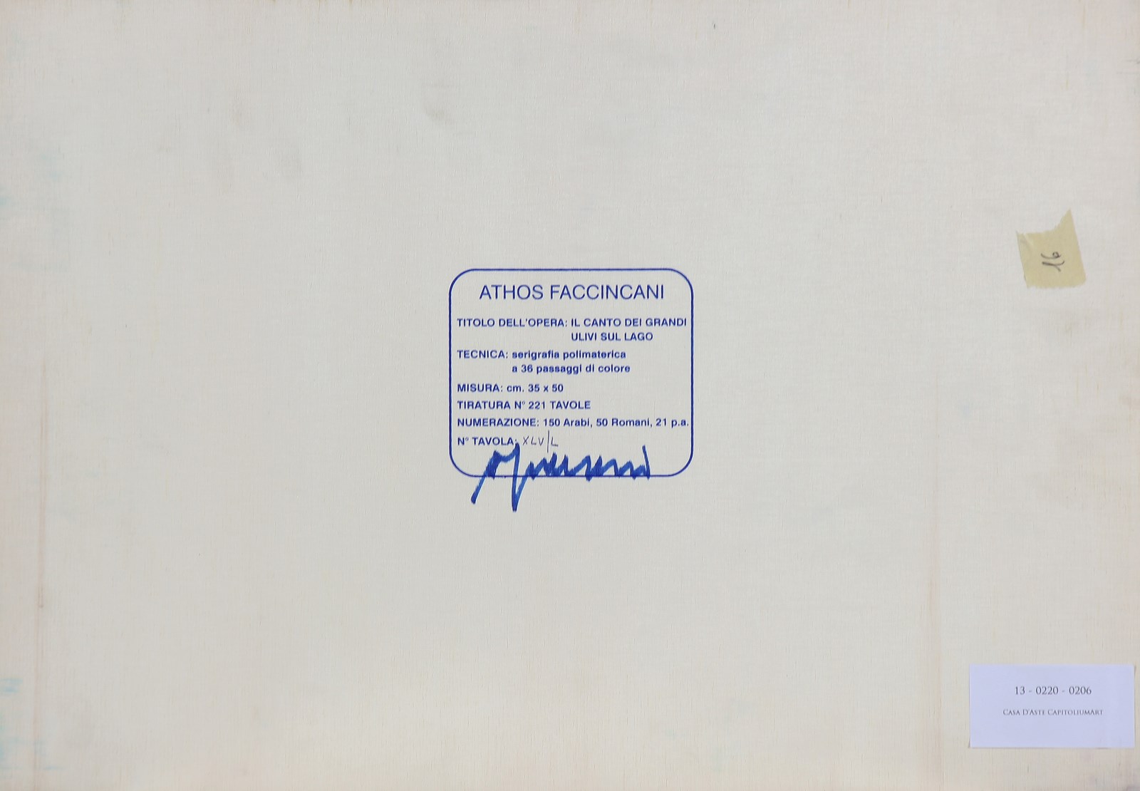 FACCINCANI ATHOS (n. 1951) Il canto dei grandi ulivi sul lago. Serigrafia su tavola. Cm 50,00 x 35,00. Tir. XLV/L e firma in basso. Al retro firma e descrizione completa dell'opera.
