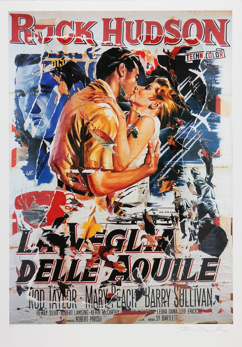 ROTELLA MIMMO (1918 - 2006) La veglia delle acquile. Litodecollage. Cm 70,00 x 100,00. Misure lastra:90 x63cm. P.A. e firma in basso a matita. Timbro a secco Fondazione Rotella, Milano in basso a sinistra. Opera pubblicata nel catalogo Elena Pontiggia, Mimmo Rotella, multiples dècollages, Silvana Editoriale, 2005, pag. 46-47.