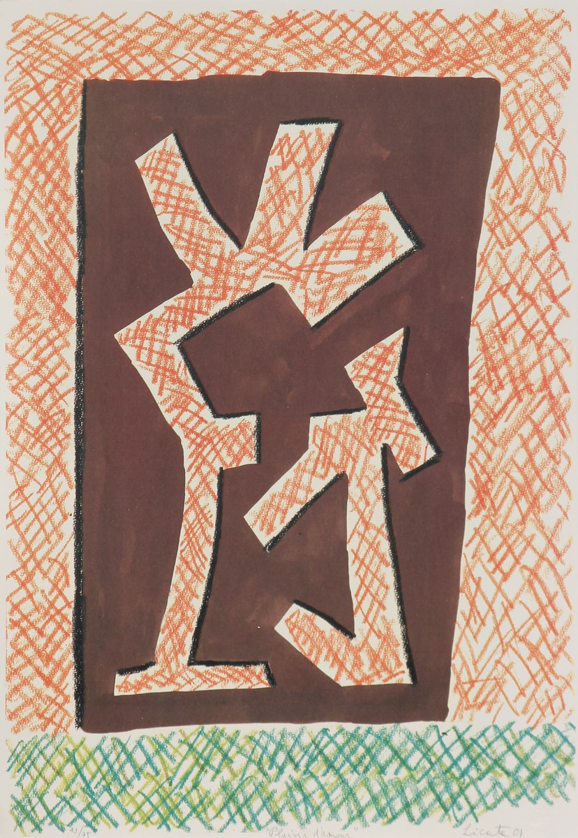 LICATA RICCARDO (n. 1929) Plaisir d'amour. 2001. Serigrafia. Cm 35,00 x 50,00. Misure lastra: 48,5x33,5 cm. Tir. 43/75, titolo, data e firma in basso a matita. Timbro a secco Tintoretto, Venezia, in basso a destra.