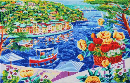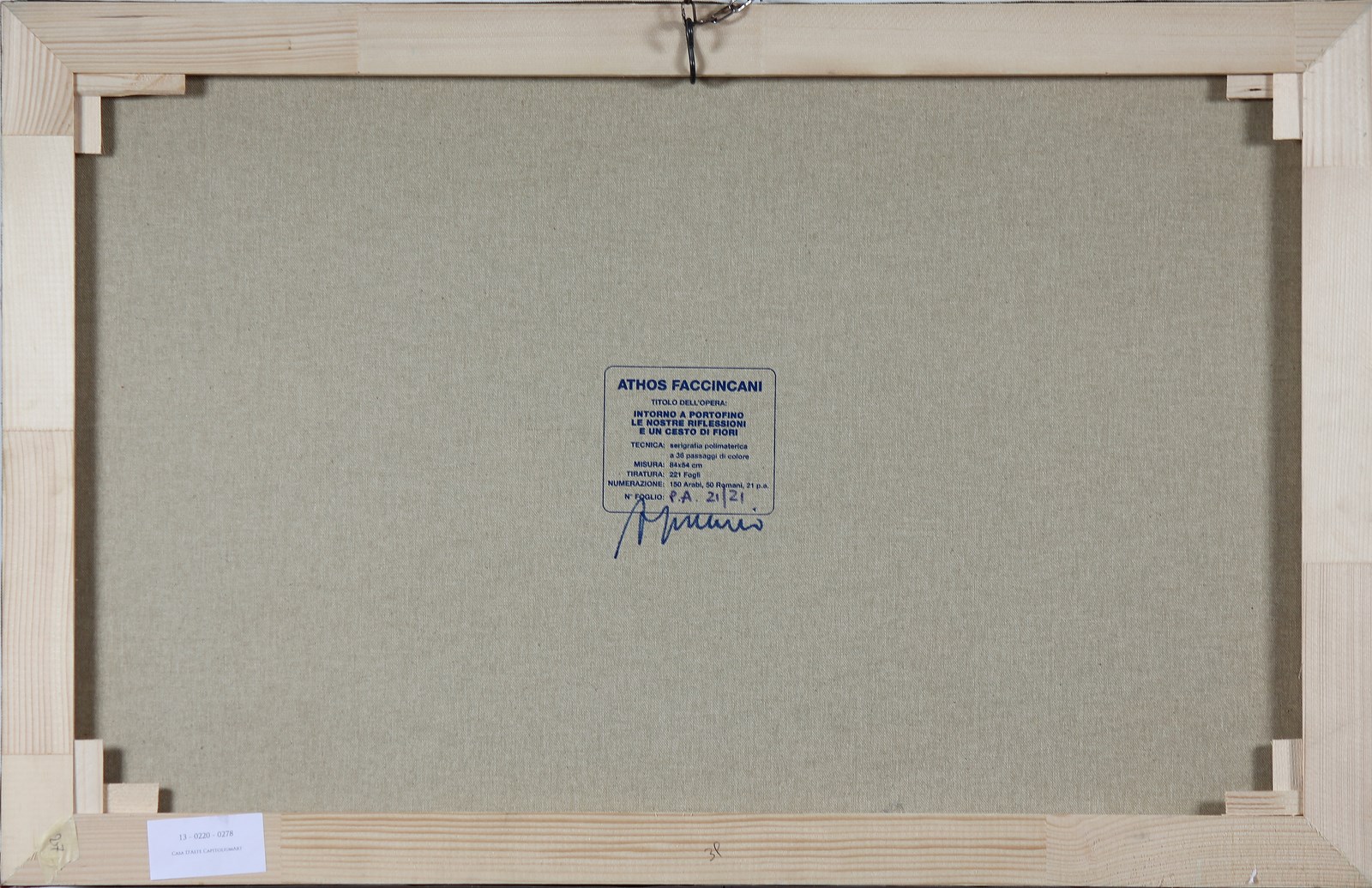 FACCINCANI ATHOS (n. 1951) Intorno a Portofino le nostre riflessioni e un cesto di fiori. Serigrafia su tela. Cm 84,00 x 54,00 x 2,00. Firma e P.A. 21/21 in basso. Al retro firma, titolo e tiratura.