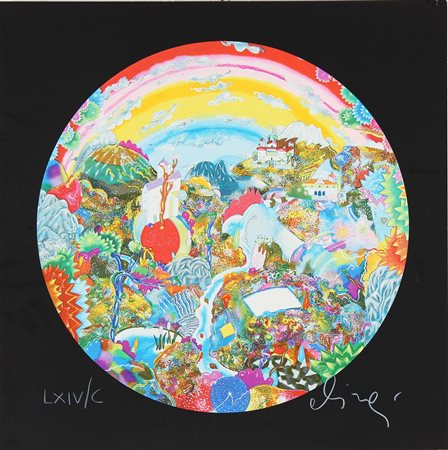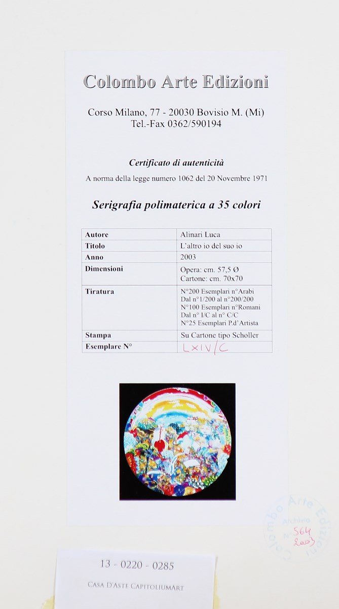 ALINARI LUCA (n. 1943) L'altro io del suo io. 2003. Serigrafia polimaterica. Cm 70,00 x 70,00. Diametro 57,5cm. Tir. LXIV/C e firma in basso. Al retro timbro e certificato di autenticità a cura di Colombo Arte Edizioni, Bovisio M. (MI).