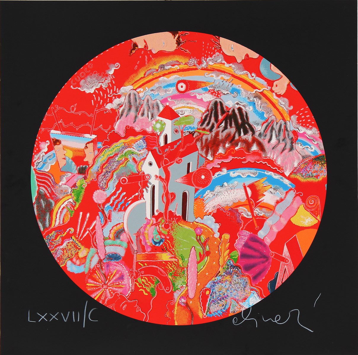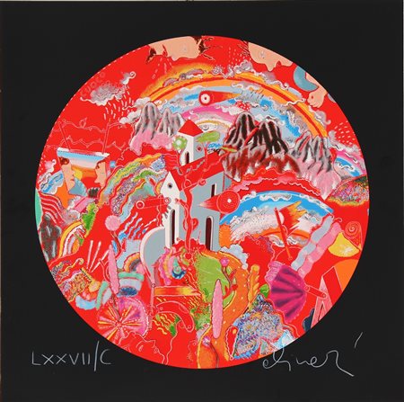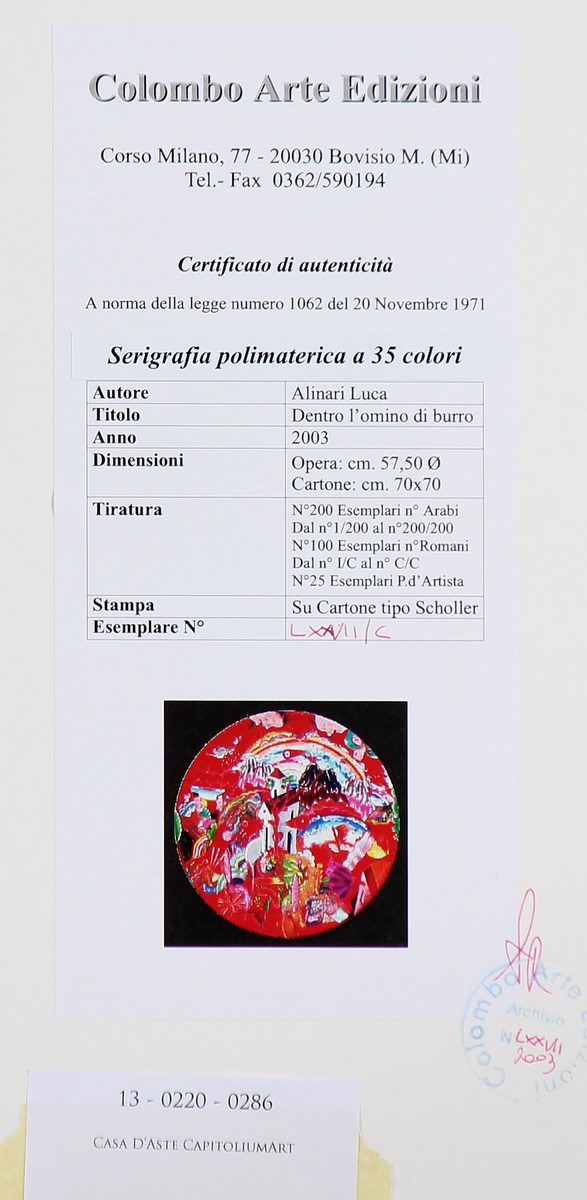 ALINARI LUCA (n. 1943) Dentro l'omino di burro. 2003. Serigrafia polimaterica. Cm 70,00 x 70,00. Diametro 57,5cm. Tir. LXXVII/C e firma in basso. Al retro timbro e certificato di autenticità a cura di Colombo Arte Edizioni, Bovisio M. (MI).