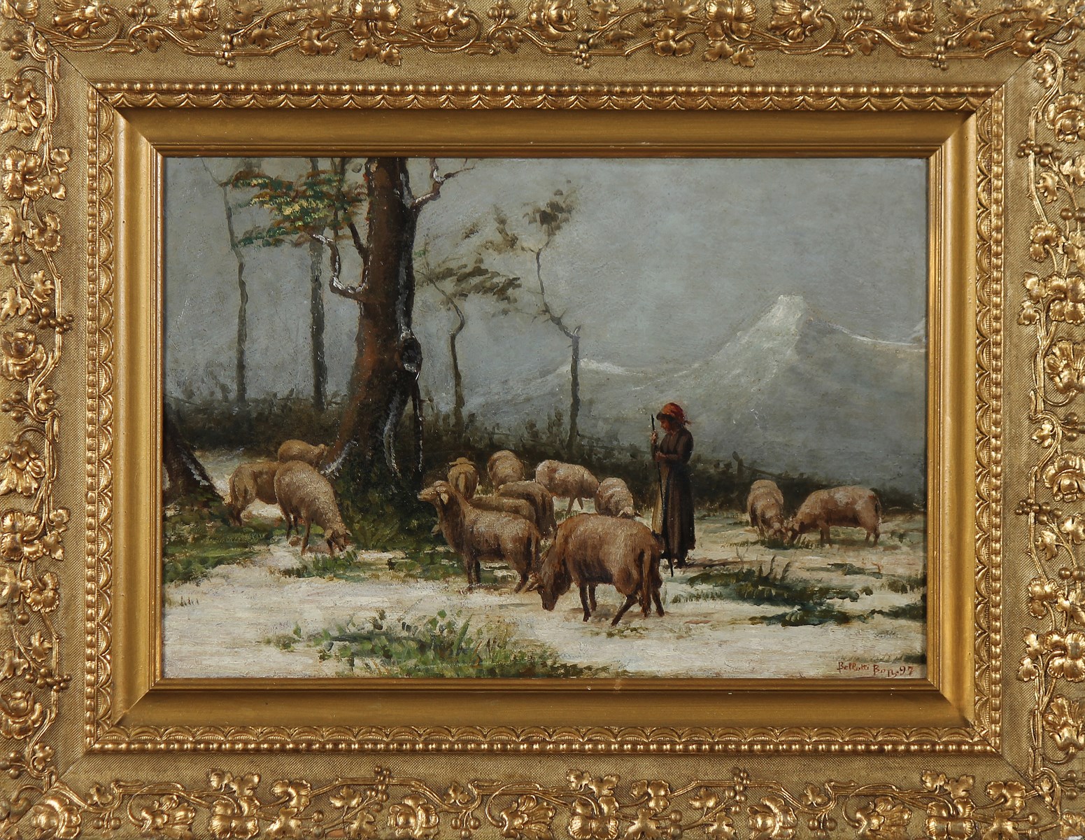 ANONIMO Scena pastorale con contadina. 1997. Olio su cartone. . Firmato Bellotti e anno in basso a destra. Cornice presente