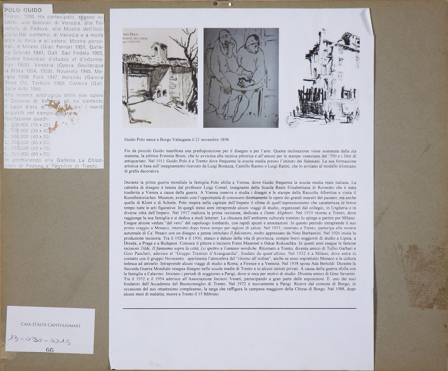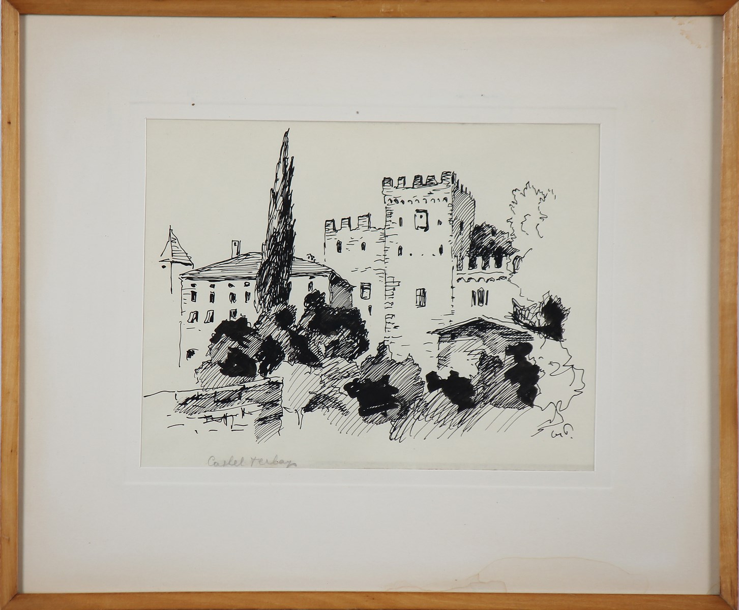 POLO GUIDO (1898 - 1988) Castello Terlago. China su carta. Cm 22,00 x 17,00. Titolo in basso a matita. Siglato in basso. Al retro cartiglio descrittivo della vita dell'artista. Cornice presente