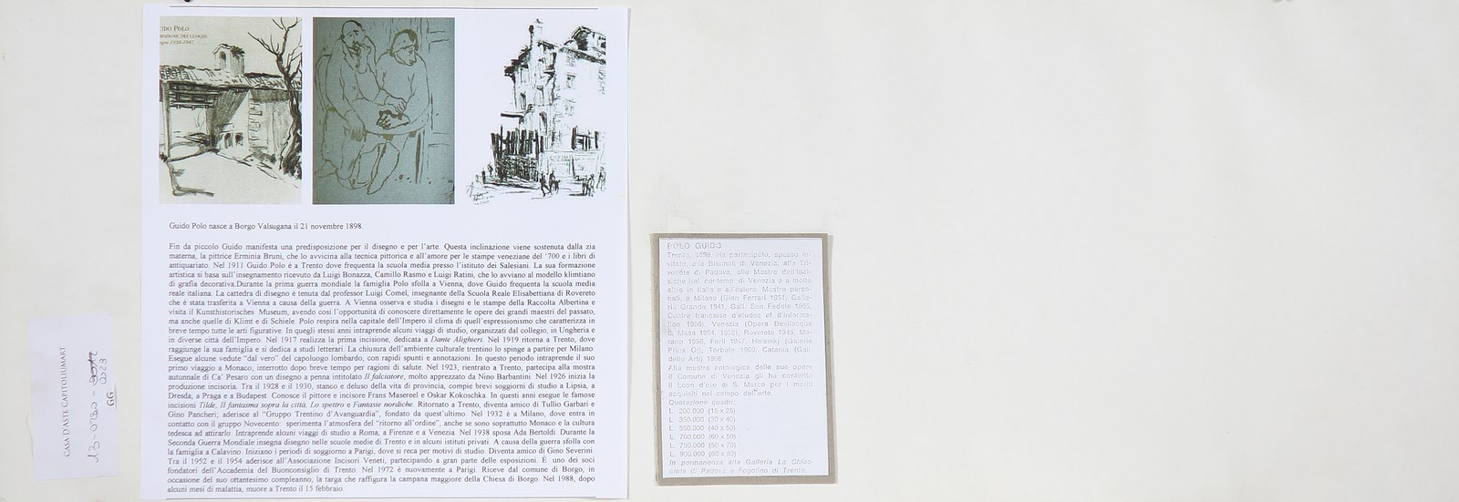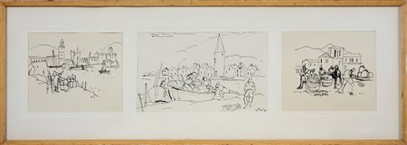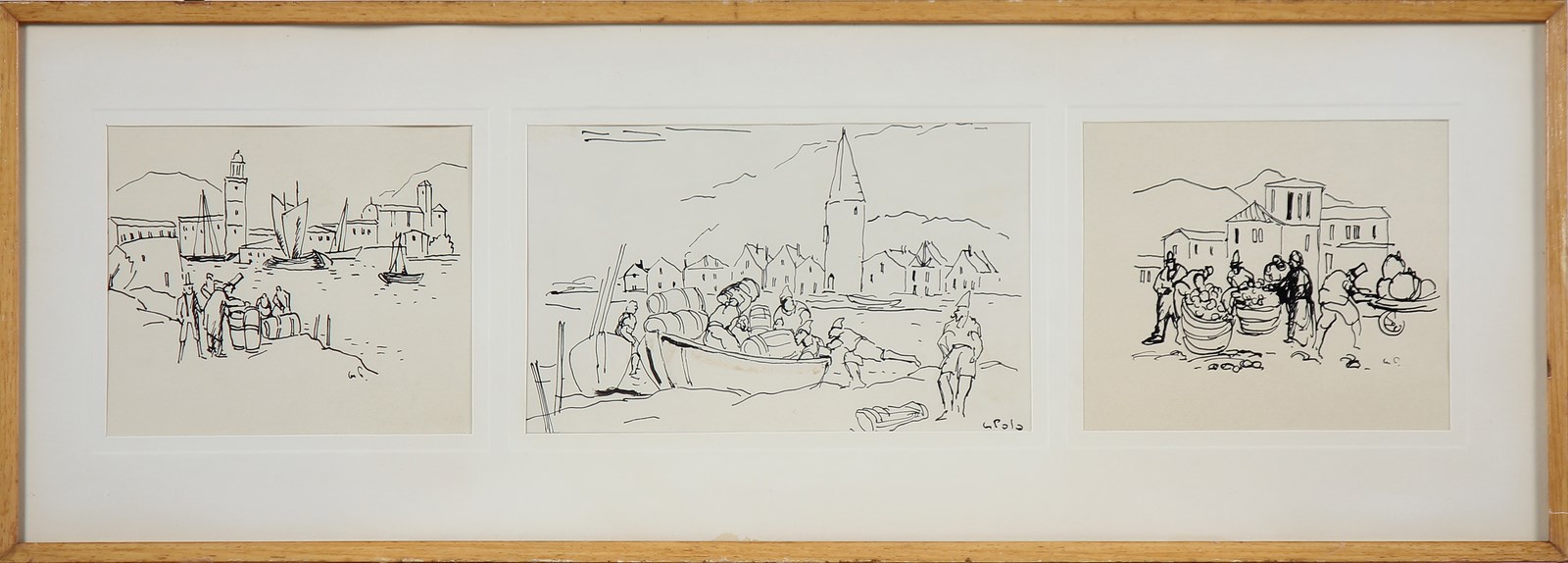 POLO GUIDO (1898 - 1988) Senza titolo. China su carta. Cm 55,00 x 13,00. Opera composta da n. 3 disegni a china siglati in basso. Al retro cartiglio descrittivo della vita dell'artista. Cornice presente
