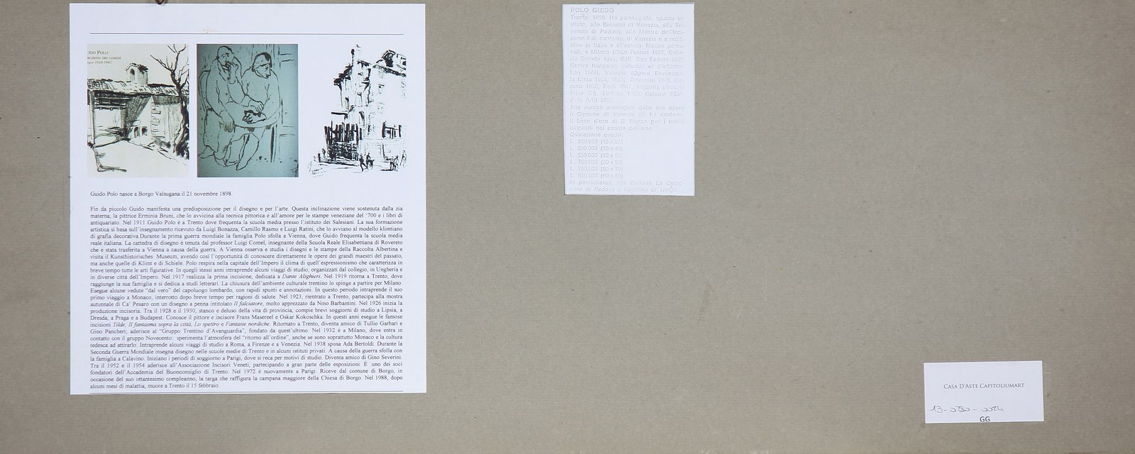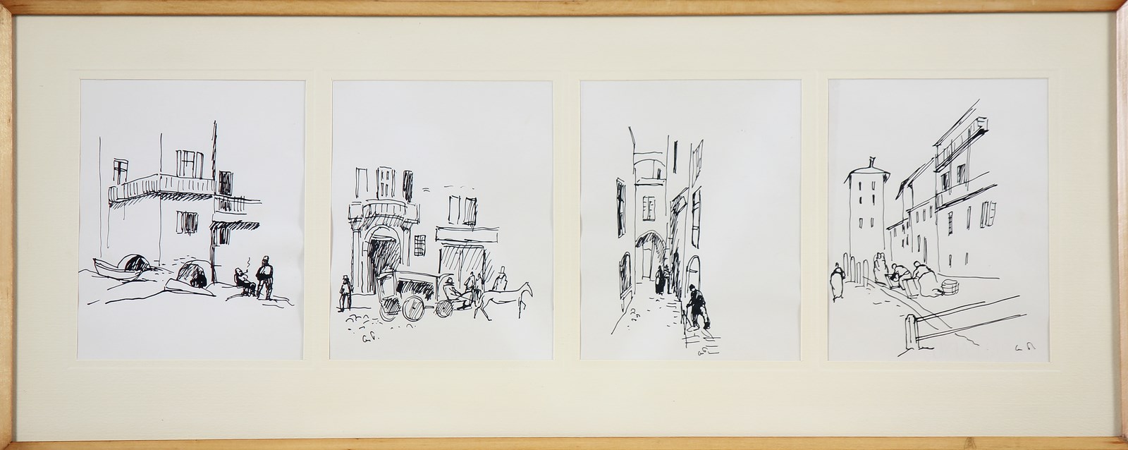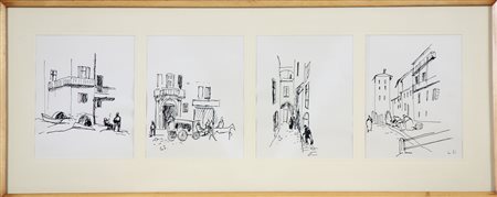 POLO GUIDO (1898 - 1988) Senza titolo. China su carta. Cm 60,00 x 18,00. Opera composta da n. 4 disegni a china di cui n.3 siglati in basso. Al retro cartiglio descrittivo della vita dell'artista. Cornice presente