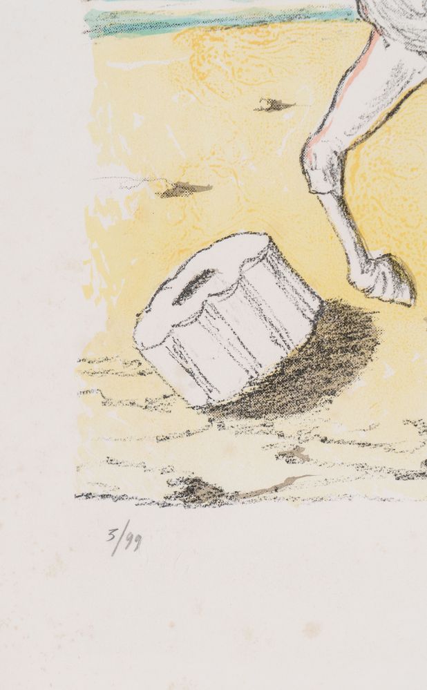 GIORGIO DE CHIRICO (Volo 1888 - Roma 1978) "Cavalli con tempio".Litografia a colori su carta. Foglio: cm 55,5x75; lastra: cm 46,5x51,5. Opera firmata in basso a destra G. De Chirico. Reca numero di tiratura in basso a sinistra 3/99. Reca timbro in basso a sinistra G. De Chirico. Opera accompagnata da certificato di autenticità a firma Alberto Caprini.