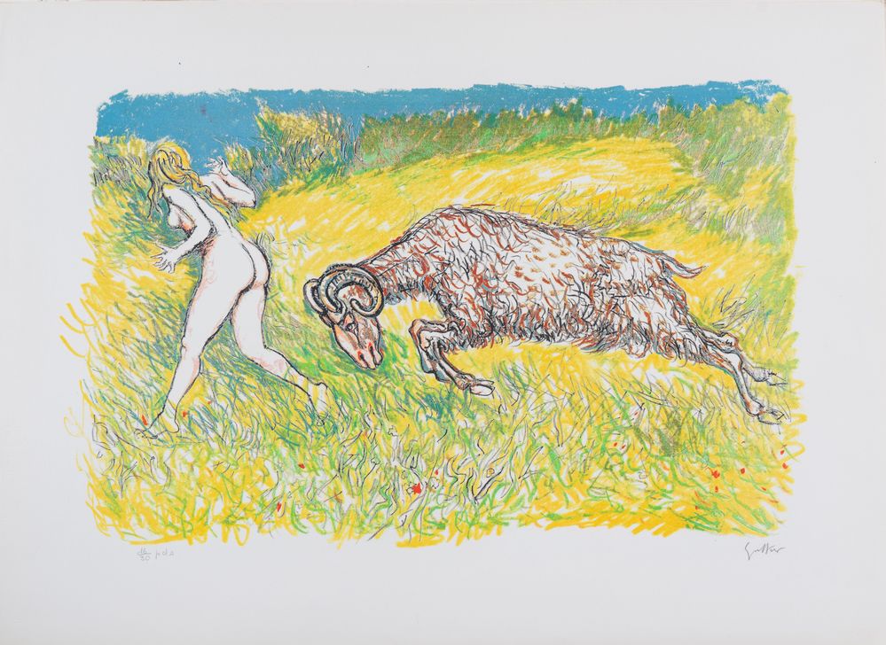 RENATO GUTTUSO (Bagheria 1911 - Roma 1987) "Segno zodiacale dell'Ariete", 1977. Litografia a colori su carta. Cm 50x70. Opera firmata in basso a destra Guttuso. Reca numeri di tiratura in basso a sinistra P.D.S. 16/30. Reca timbro Sigart di Franco Cioppi.