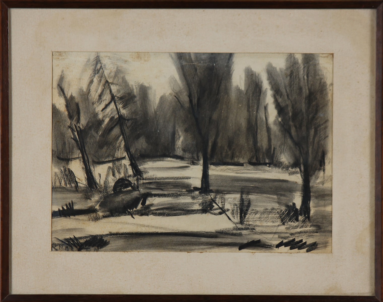 ANONIMO Paesaggio. . Carboncino su carta. Cm 32,00 x 23,00 x 1,20. Firmato R. Mazzon in basso a sinistra. Cornice presente
