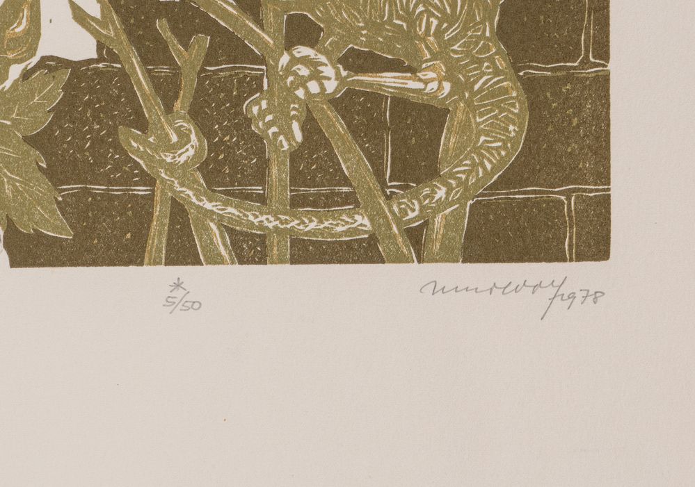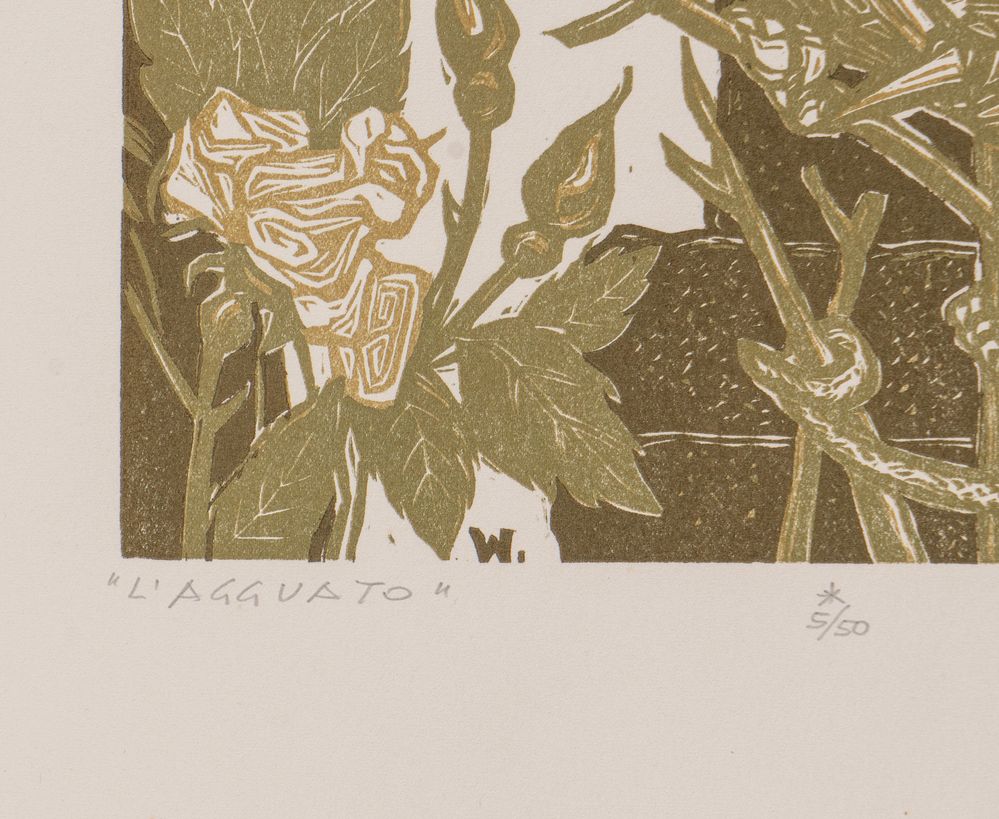 REMO WOLF (Trento 1912 - 2009) "L'agguato", 1978. Xilografia. Lastra: cm 35x24,5; foglio: cm 50x35. Opera intitolata in basso a sinistra. Reca numeri di tiratura in basso al centro 5/50. Opera firmata e datata in basso a destra.
